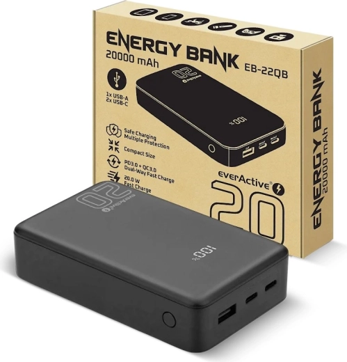 Spoľahlivý zdroj energie na cesty aj do kancelárie. Táto powerbanka s kapacitou 20 000 mAh a výkonom až 20 W zvládne rýchlo dobiť moderné smartfóny, tablety aj drobnú elektroniku. Vďaka dvom portom USB‑C (vstup/výstup) a jednému USB‑A ľahko obslúžite až tri zariadenia súčasne, zatiaľ čo LCD displej presne ukáže stav batérie.