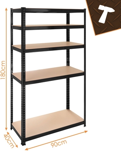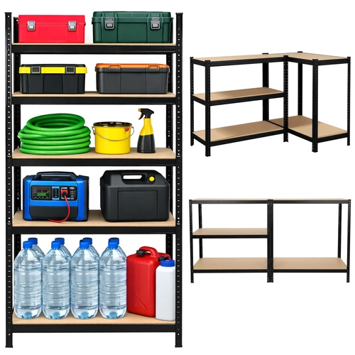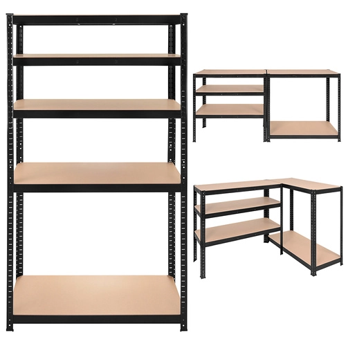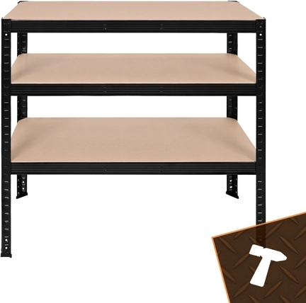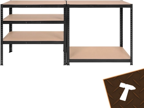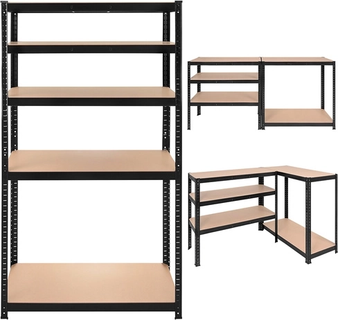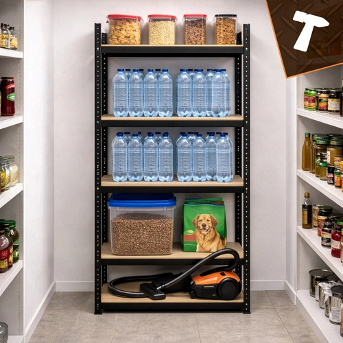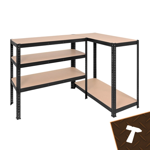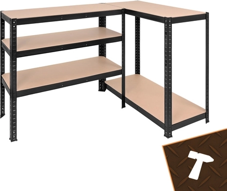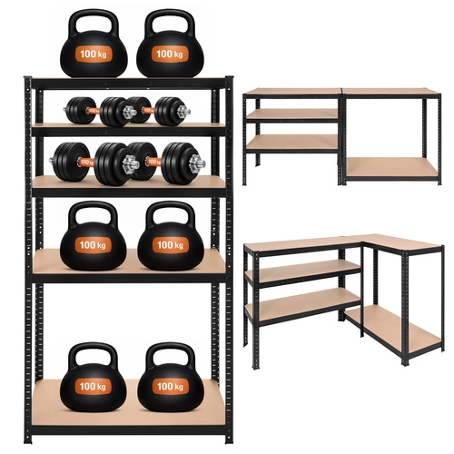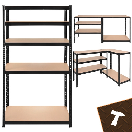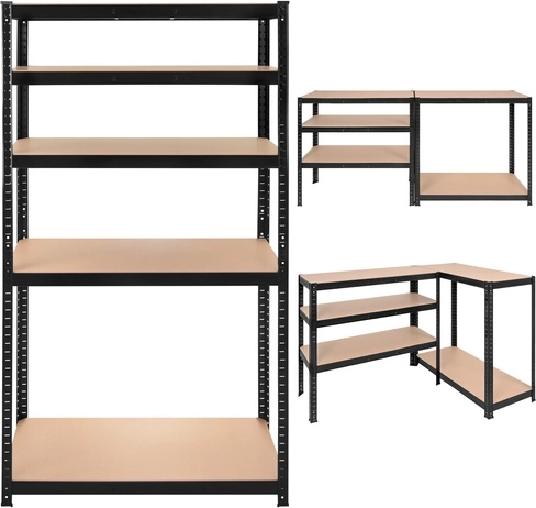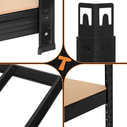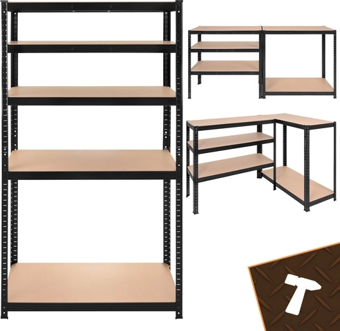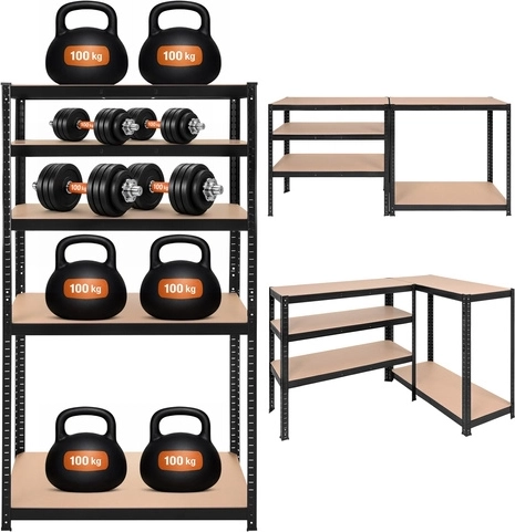 Montáž je rýchla a bezskrutková – jednotlivé prvky sa do seba zacvaknú, postačí gumové kladivo. Police možno výškovo nastaviť po 30 mm, takže ľahko uložíte krabice, náradie, pneumatiky aj zásoby. Systém 3 v 1 umožňuje postaviť vysoký regál, rozdeliť ho na dva nižšie segmenty alebo vytvoriť rohové riešenie pre maximálne využitie priestoru.
