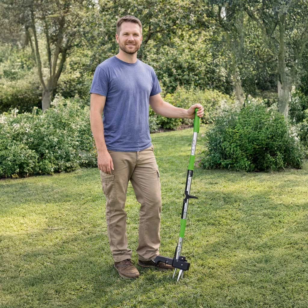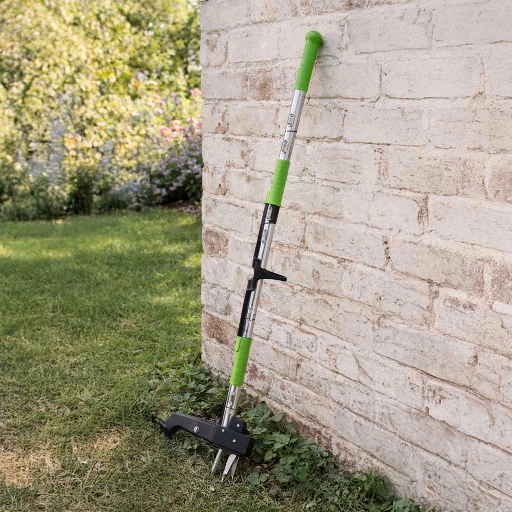 Dlhá teleskopická násada a páka pri hlave umožňuje pracovať v stoji a šetriť chrbát aj kolená. Ideálne na dlhšie práce na trávniku aj záhonoch.