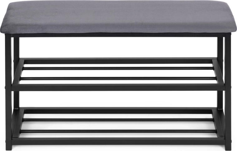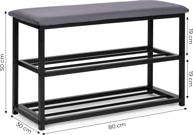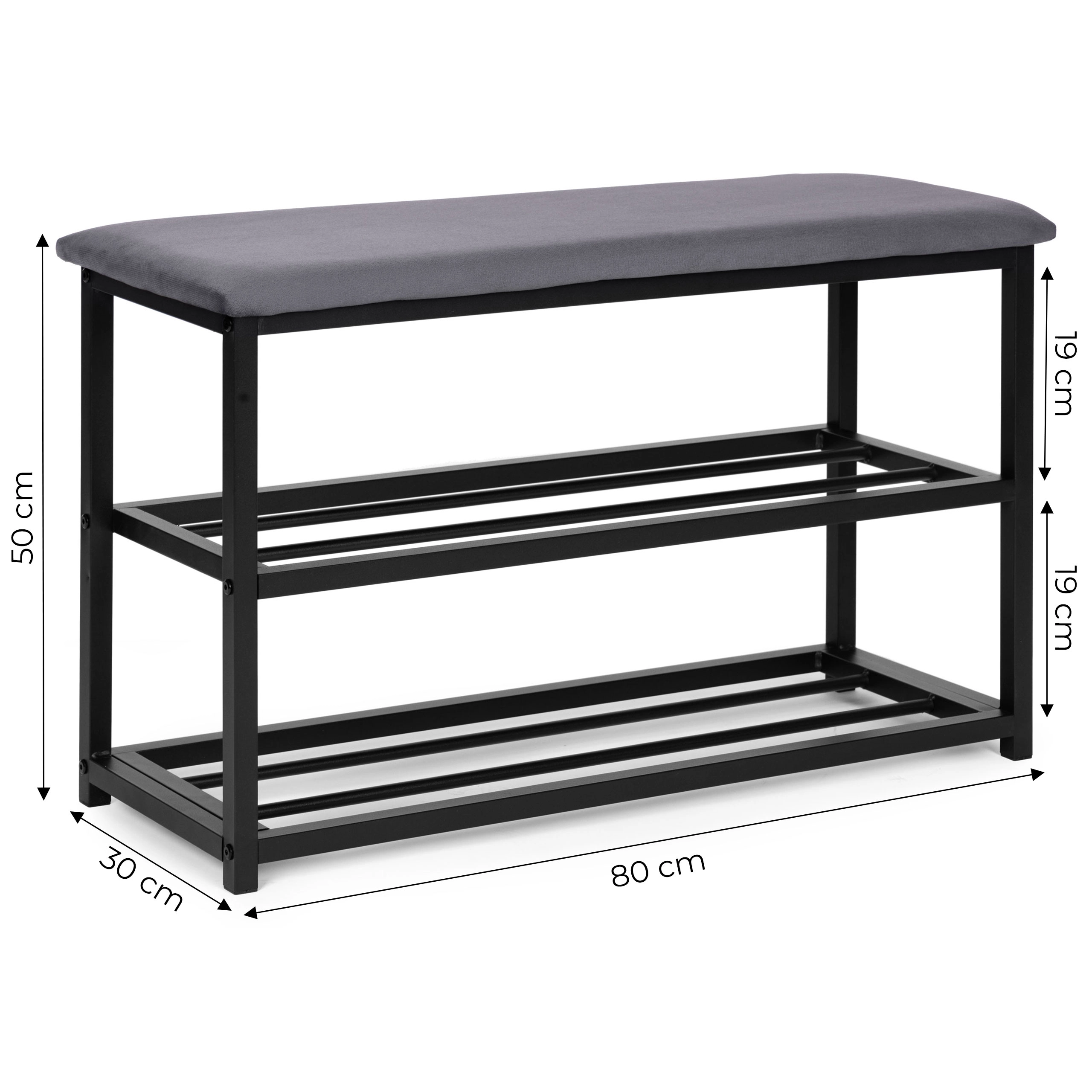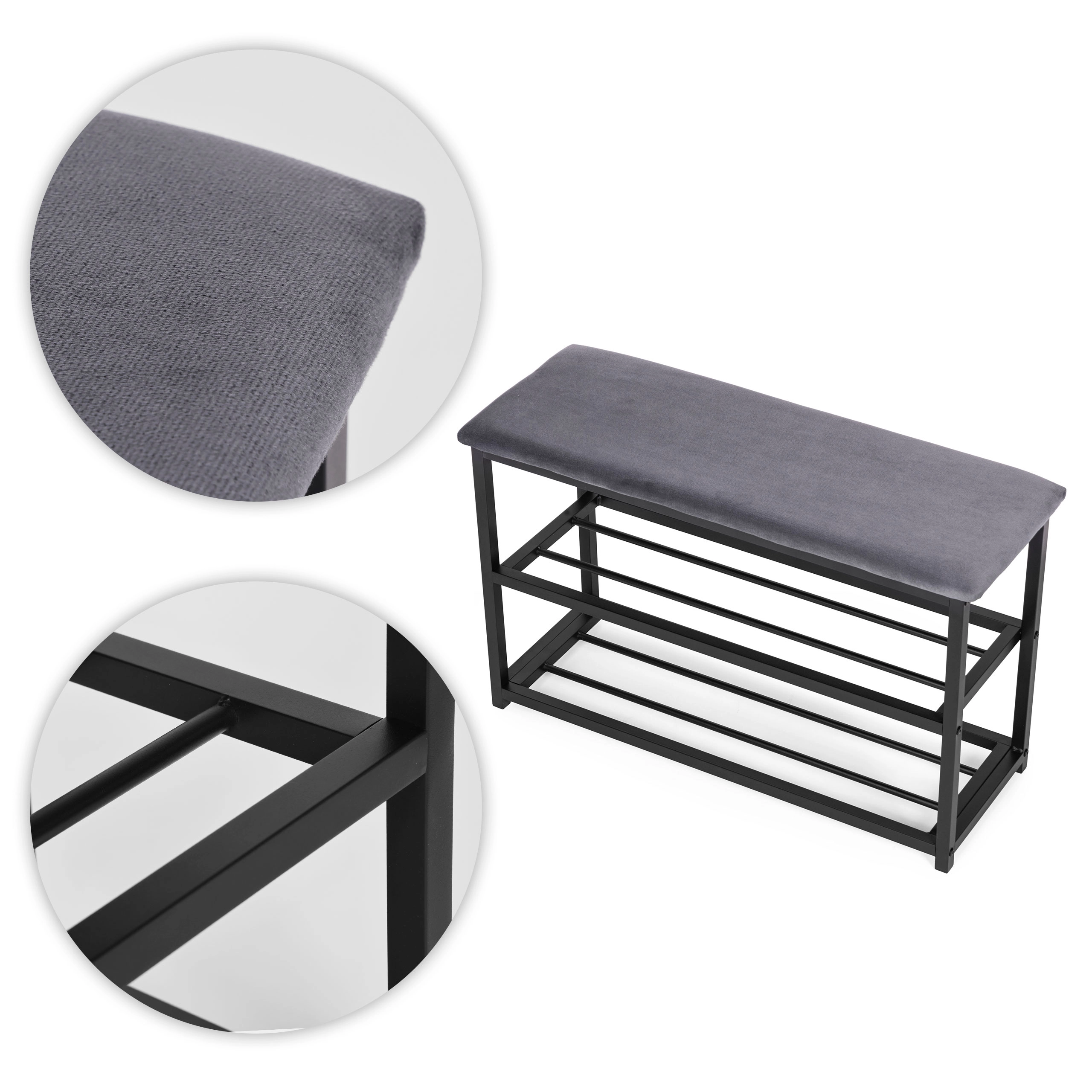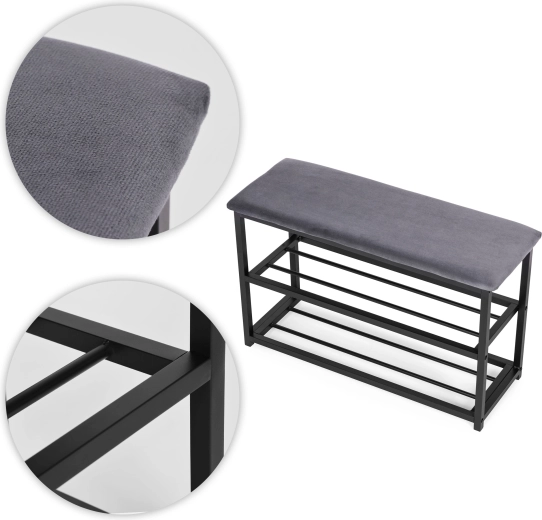 Štýlová lavica na topánky ModernHome kombinuje úložný priestor a pohodlné sedenie v jednom. Vďaka dvom policám pojme až 8 párov obuvi a jej mäkký zamatový sedák uľahčí obúvanie. Práškom lakovaný oceľový rám zaisťuje stabilitu a dlhú životnosť, zatiaľ čo otvorené police poskytujú prehľadnosť a vetranie obuvi. Ideálna do predsiene, šatne aj šatníkovej skrine.