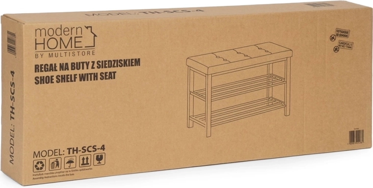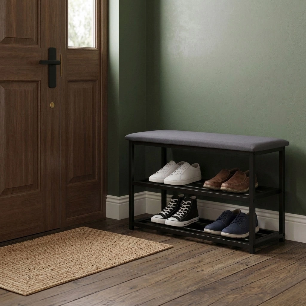 Sedák tvorí MDF doska, vrstva peny a poťah zo zamatovej látky s celkovou hrúbkou cca 3 cm – príjemný na dotyk, elegantný na pohľad a pohodlný pri obúvaní aj vyzúvaní. Otvorený dizajn políc zaisťuje rýchly prístup a lepšiu cirkuláciu vzduchu, takže obuv ľahšie presychá a zostáva svieža.