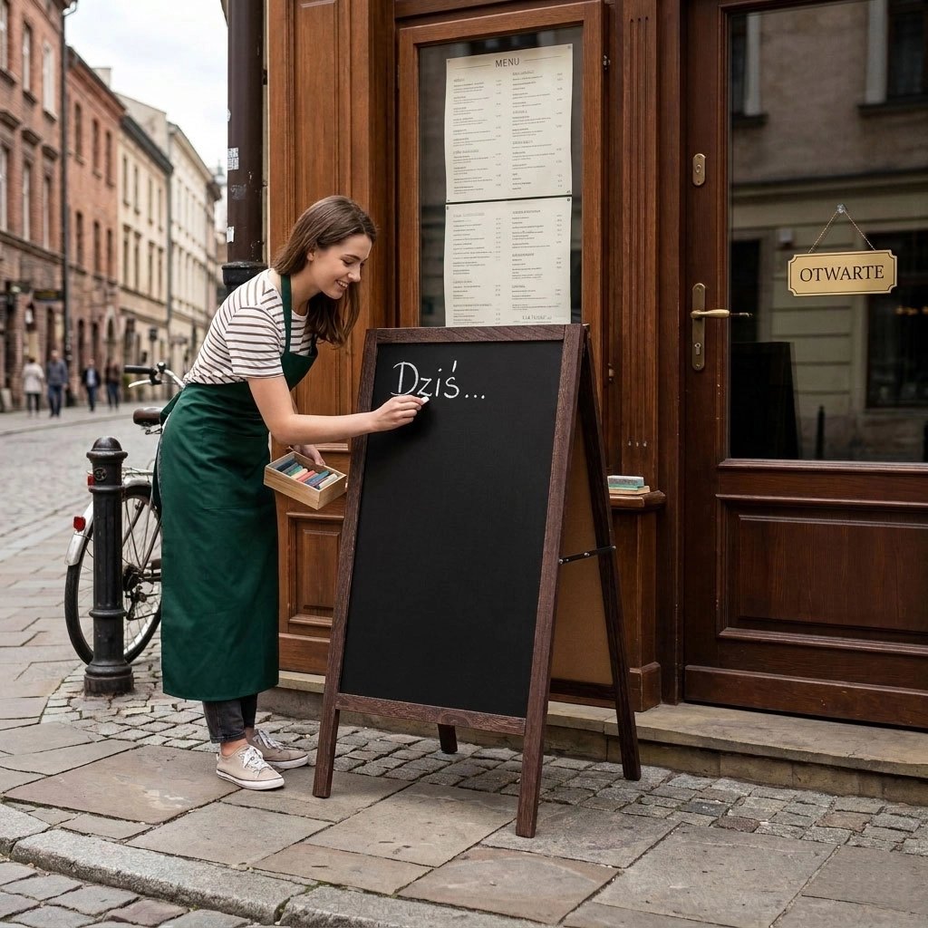 Obojstranná reklamná tabuľa priťahuje pozornosť okoloidúcich a zvyšuje viditeľnosť vašej ponuky. Umiestnená pred vchodom, výkladom alebo na frekventovanom mieste okamžite informuje o akciách, dennom menu či dôležitých oznamoch a motivuje zákazníkov k návšteve.
