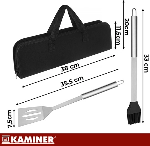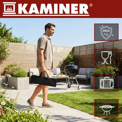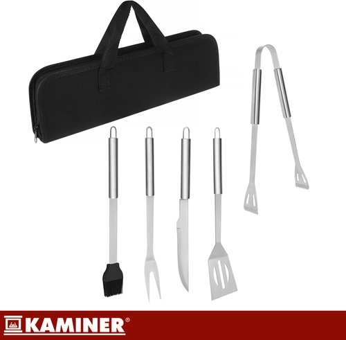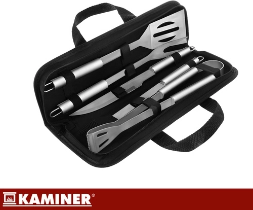 Praktická sada grilovacieho náradia KAMINER udrží všetko pokope v pevnom puzdre, takže máte nástroje vždy po ruke. Obsahuje 5 základných pomôcok z nehrdzavejúcej ocele s dlhými rukoväťami pre bezpečnejšiu prácu pri žiare, každý kus má háčik na zavesenie. Vďaka organizovanému puzdru s pružnými úchytmi je prenášanie aj skladovanie rýchle a prehľadné.
