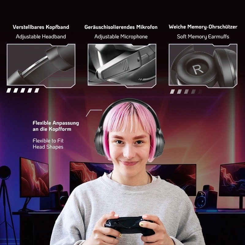 Slúchadlá LOGILINK BT0070 sú navrhnuté pre hráčov, ktorí vyžadujú stabilné bezdrôtové spojenie, dlhú výdrž a maximálny komfort. Uzavretá konštrukcia pomáha lepšie izolovať okolitý hluk, takže sa môžete sústrediť na hru aj tímovú komunikáciu. Integrované ovládacie prvky na mušliach umožňujú rýchle nastavenie hlasitosti a správu hovoru bez nutnosti siahať po telefóne či klávesnici.