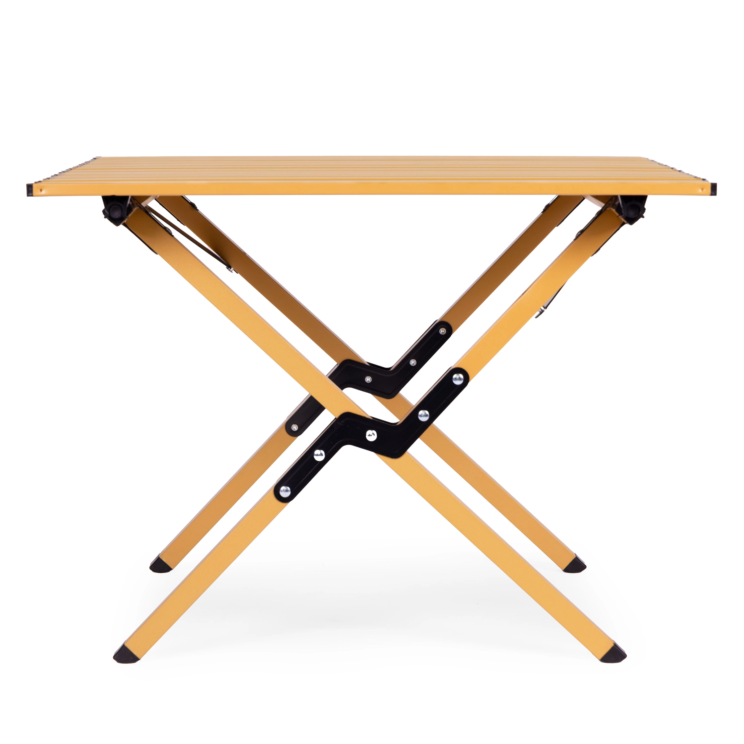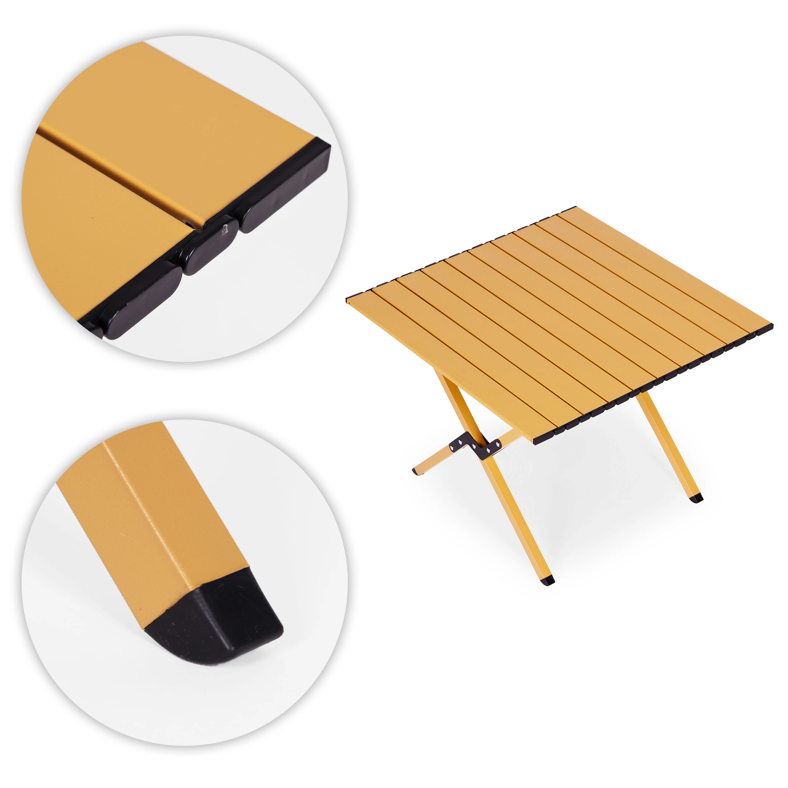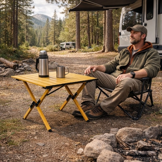 Stôl zložíte aj rozložíte behom chvíľky a vďaka aretačným prvkom drží pevne na svojom mieste. Protišmykové pätky zvyšujú stabilitu na tráve, hline aj terase. Po použití všetko jednoducho zbalíte do priloženej tašky – perfektné riešenie na kemp, k vode aj na záhradu.