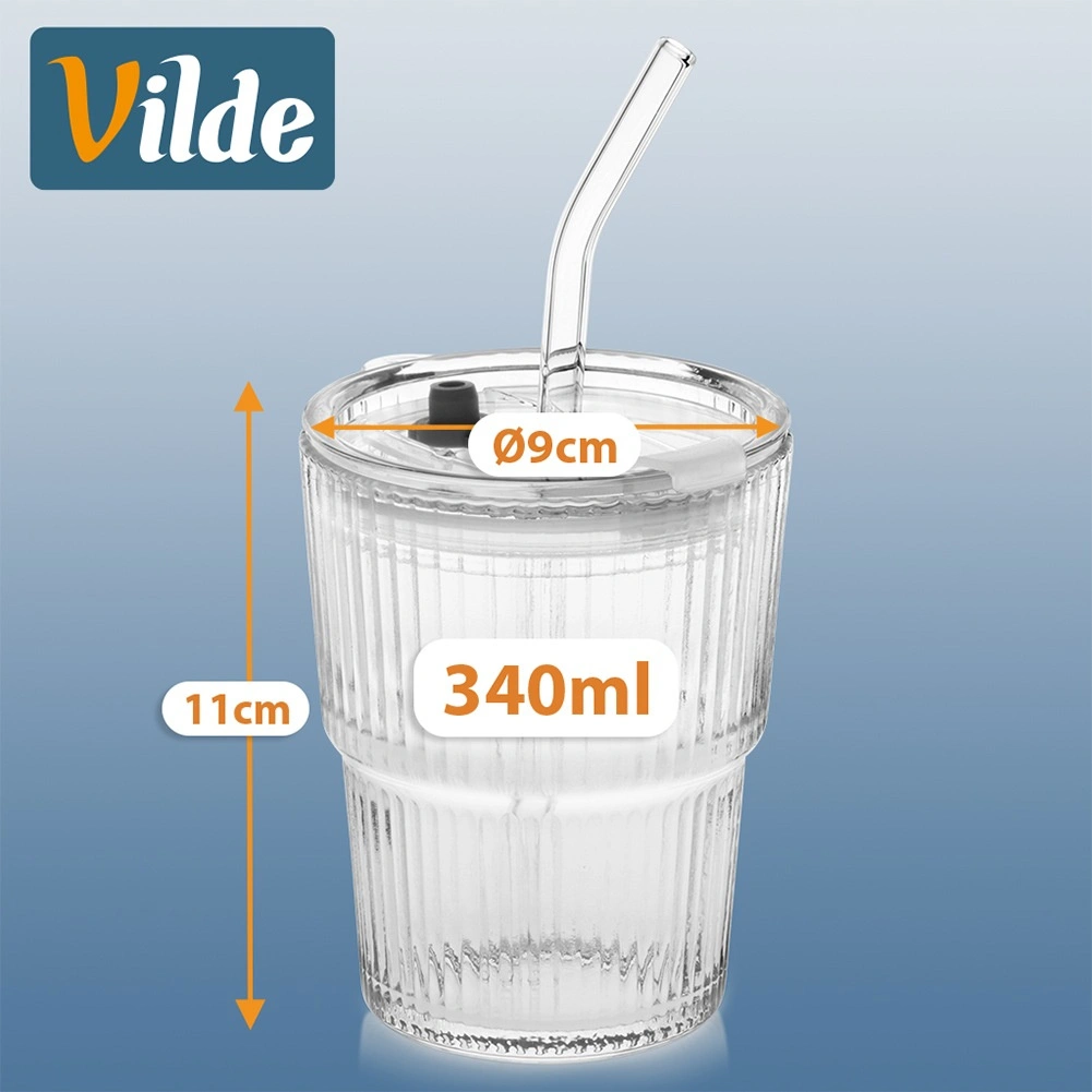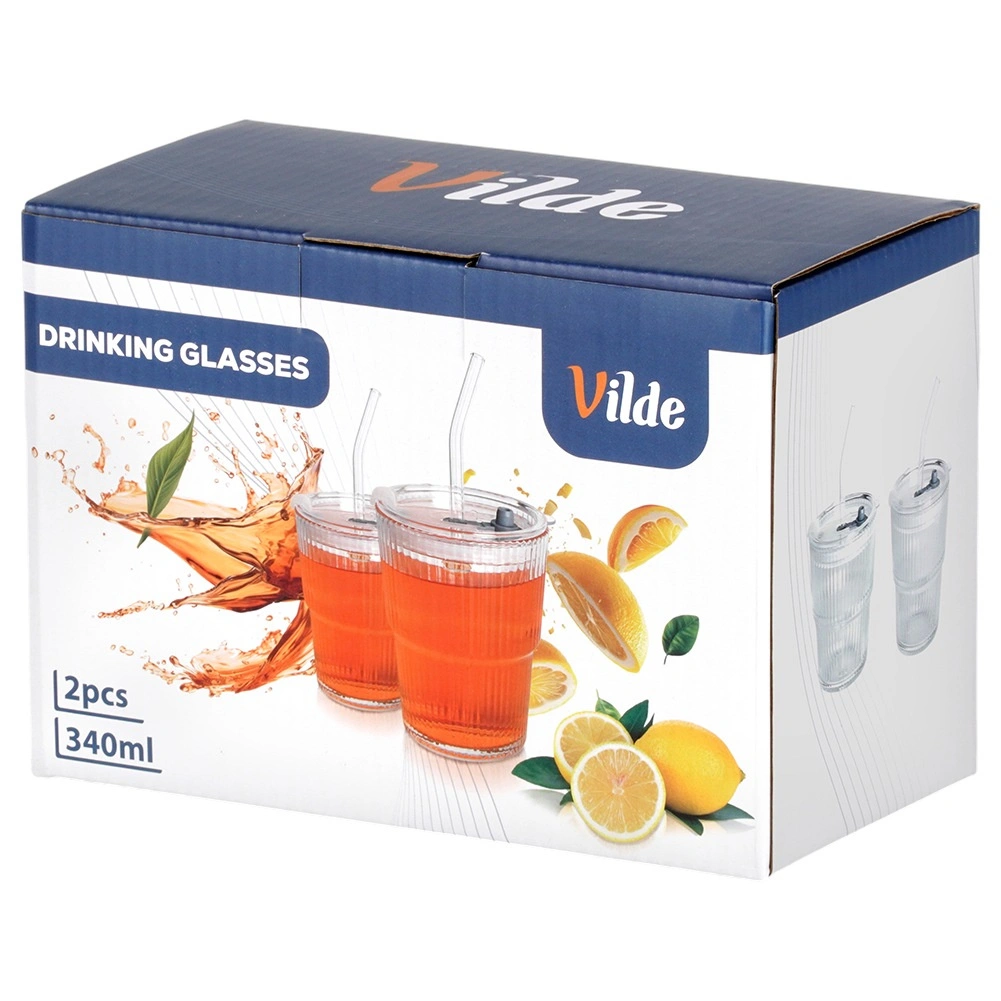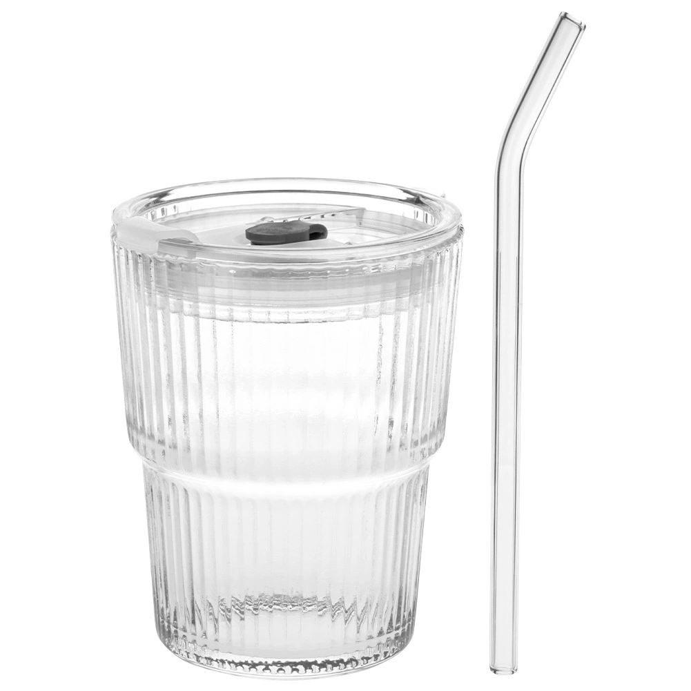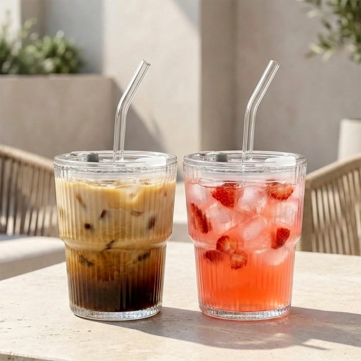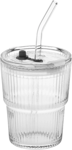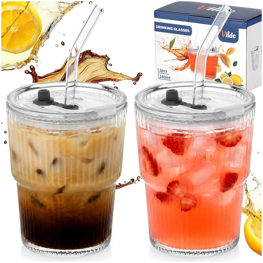 Štýlová sada 2 sklenených tumblerov s objemom 340 ml s viečkom so silikónovým tesnením a znovupoužiteľnou slamkou. Ryhované sklo lepšie padne do ruky, priehľadné prevedenie zvýrazní farbu nápoja. Ideálne na ľadovú kávu, čaj, limonády aj džúsy doma, v práci aj na terase. Jednoduchá údržba – vhodné do umývačky riadu.