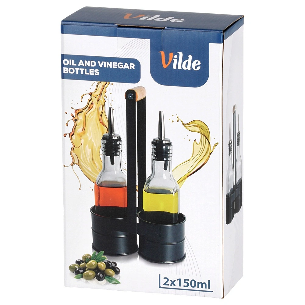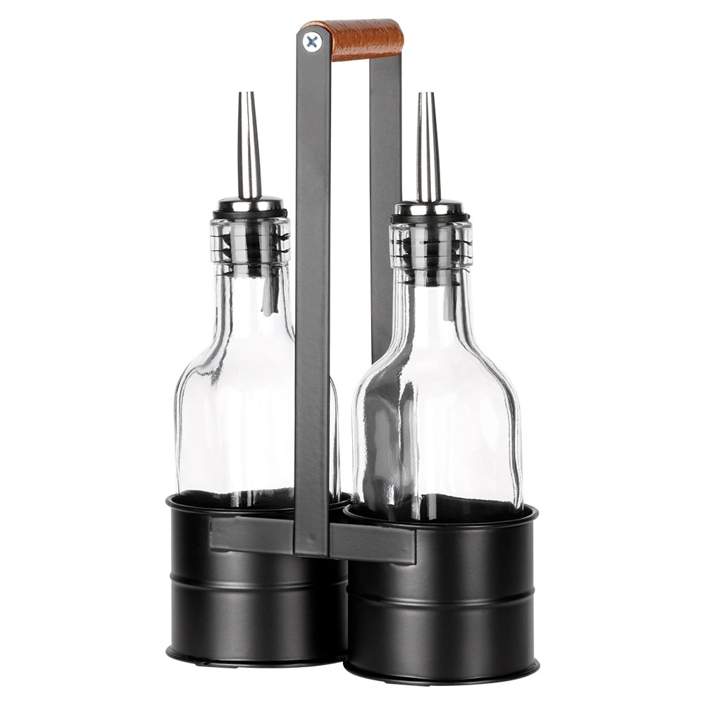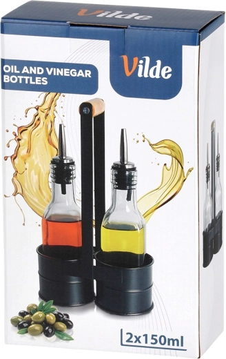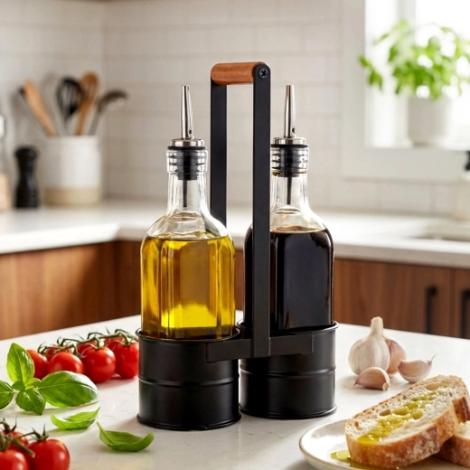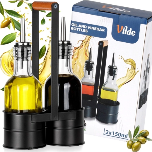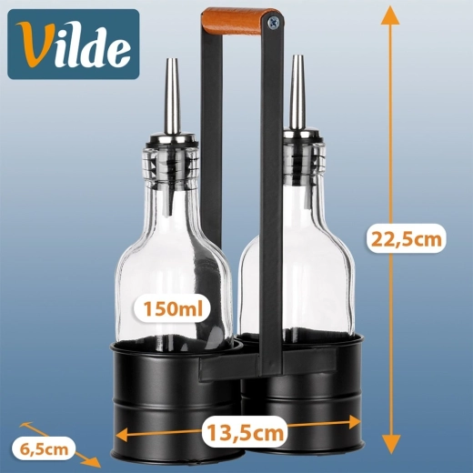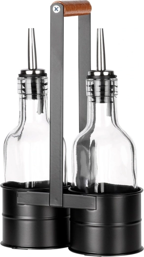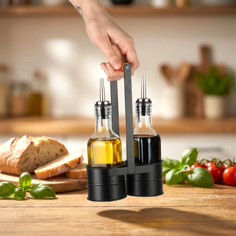 Táto dizajnová súprava 2 fliaš z číreho skla je ideálna na skladovanie a servírovanie olivového oleja aj octu. Kovový stojan v čiernej farbe s pohodlným dreveným úchytom udrží fľaše bezpečne pokope a uľahčí prenášanie po kuchyni aj jedálenskom stole. Nerezové nálevky spomaľujú prietok a minimalizujú kvapkanie, takže dochádza k kontrolovanému a bezproblémovému nalievaniu.