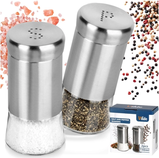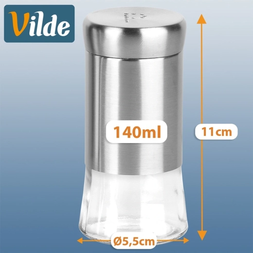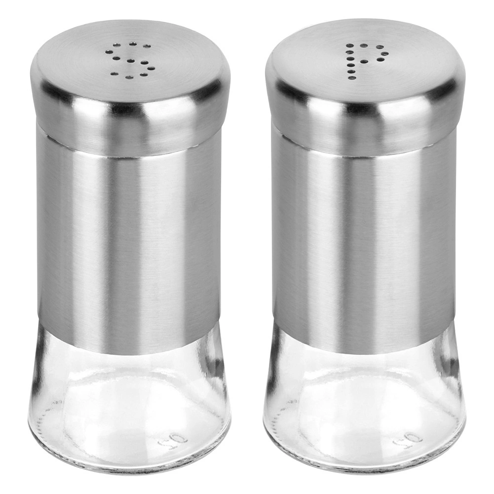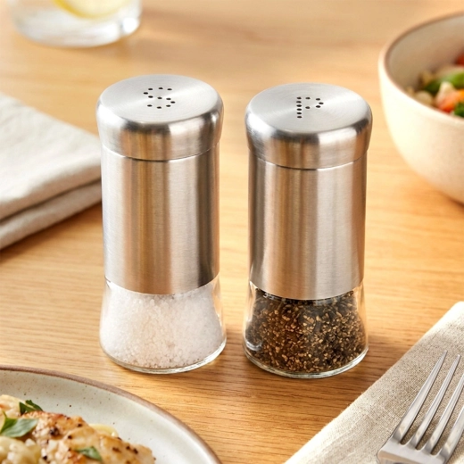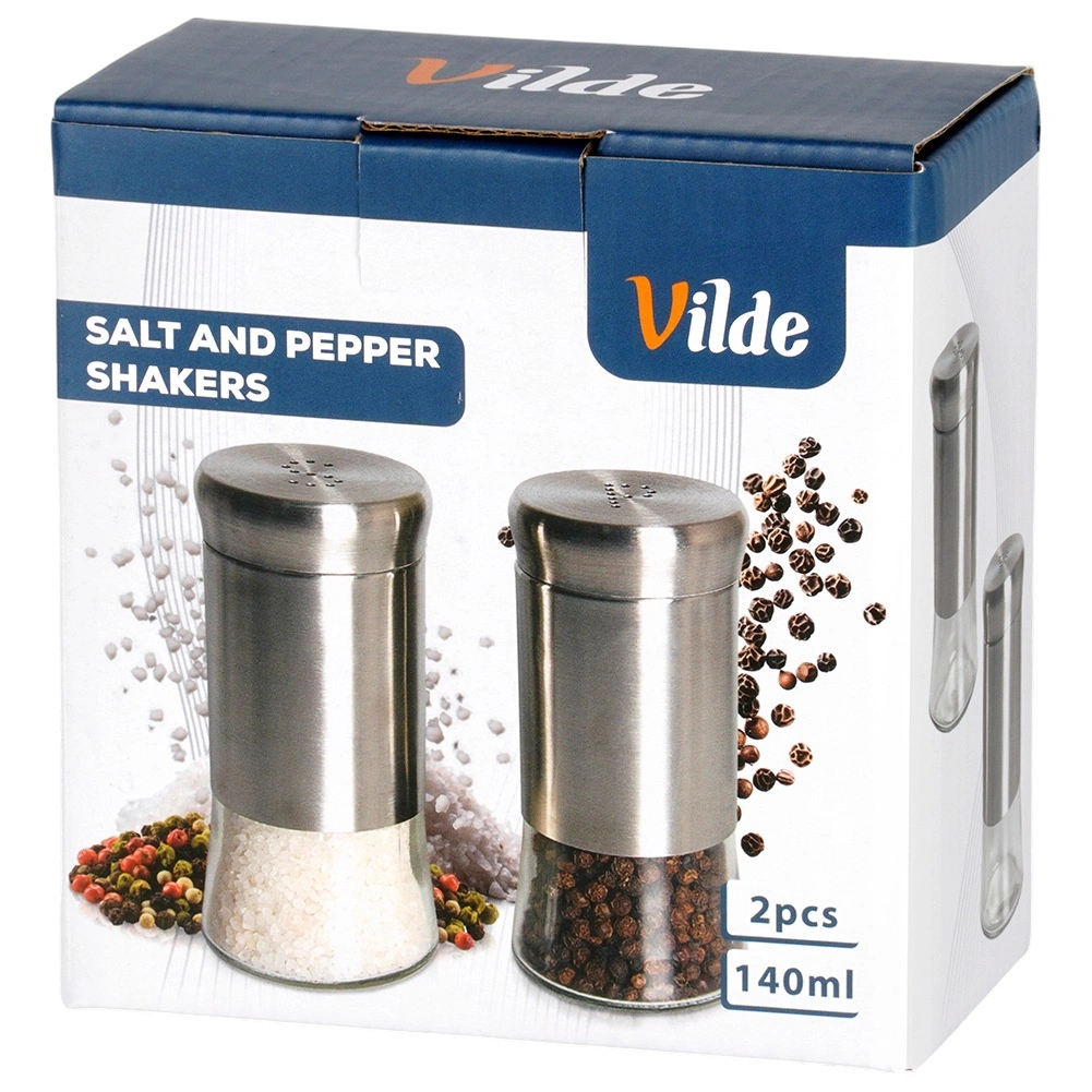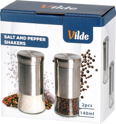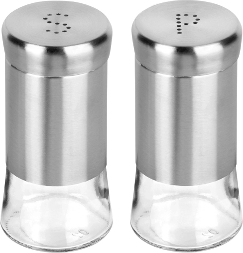 Sada soľničky a koreničky je vyrobená z kvalitného číreho skla s nerezovým horným dielom a viečkom v elegantnom striebornom prevedení. Praktické perforácie vytvárajúce písmená S a P umožňujú pohodlné a rovnomerné sypanie bez rizika presolenia či prekorenenia.