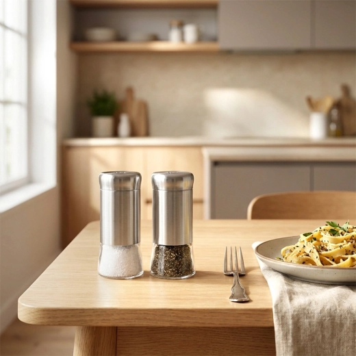 Vďaka priehľadnej časti máte okamžitý prehľad o stave náplne, takže vždy viete, kedy doplniť. Nadčasový vzhľad sa skvele hodí na jedálenský stôl, do domácnosti aj do reštaurácie. Každý zásobník má kompaktné rozmery 5,5 × 11 cm a objem 140 ml – ideálne na každodenné používanie.