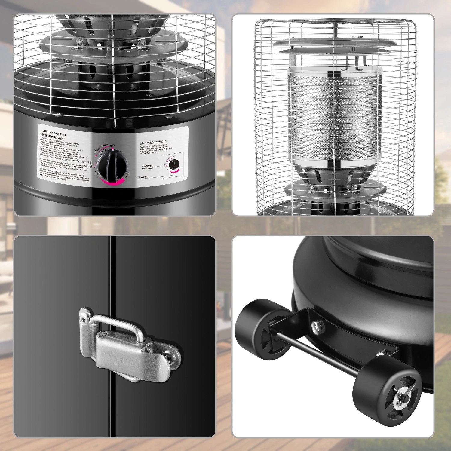 Obsluha je intuitívna: plynulá regulácia výkonu a spoľahlivé piezo zapaľovanie zaistia rýchly štart a presné nastavenie teploty. Uzamykateľná skrinka pre fľašu do 11 kg udržuje čistý vzhľad aj bezpečnosť. Kolieska uľahčujú manipuláciu a priložený obal chráni prístroj pred dažďom a prachom.