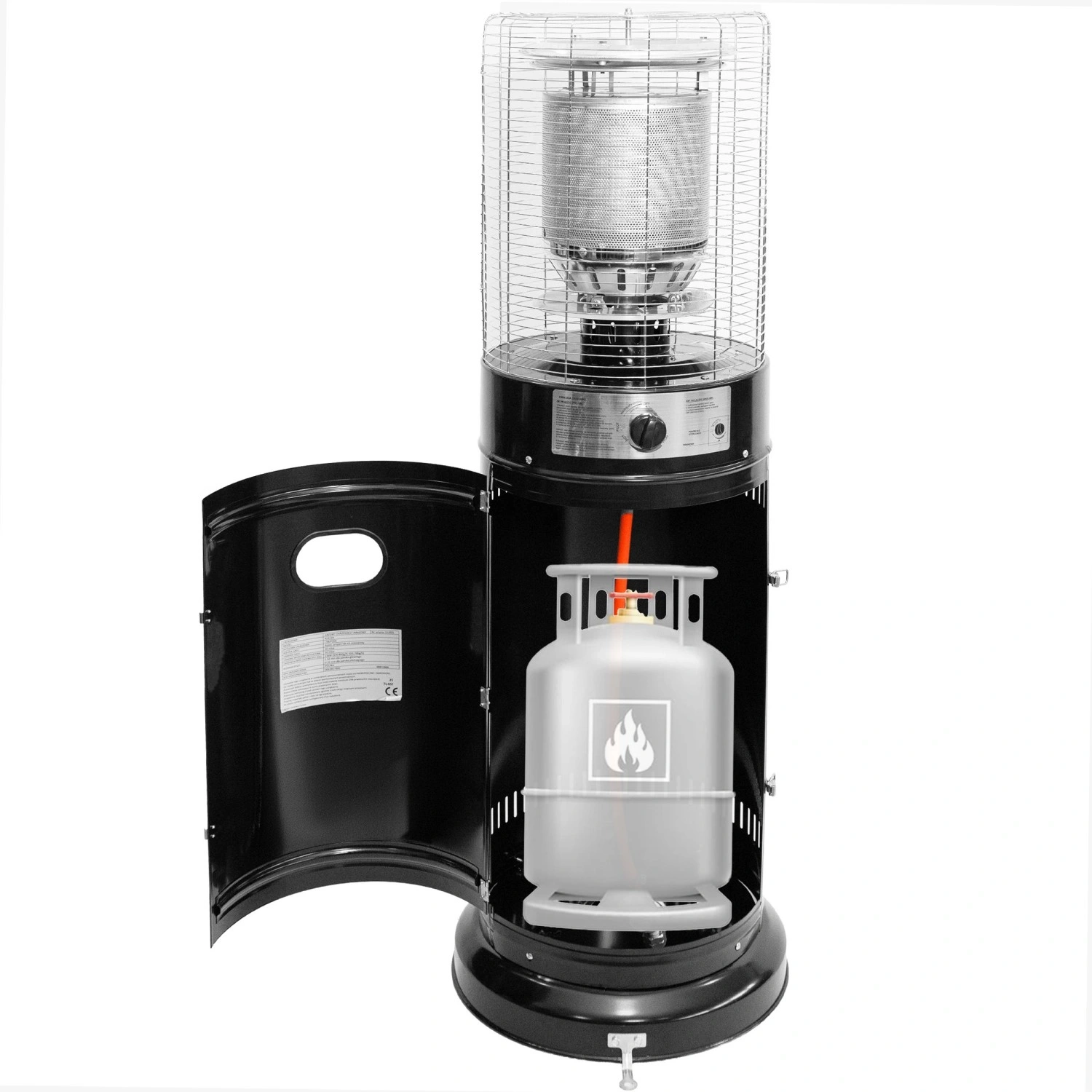 Uzamykateľný priestor pre plynovú fľašu do 11 kg a integrované kolieska pre pohodlné presunutie ohrievača podľa potreby.