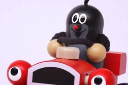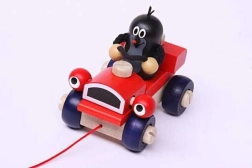 Drevené montážne auto s motívom Krtka, ktoré pri pohybe žmurká. Vhodné pre zábavu a rozvoj motorických zručností detí.