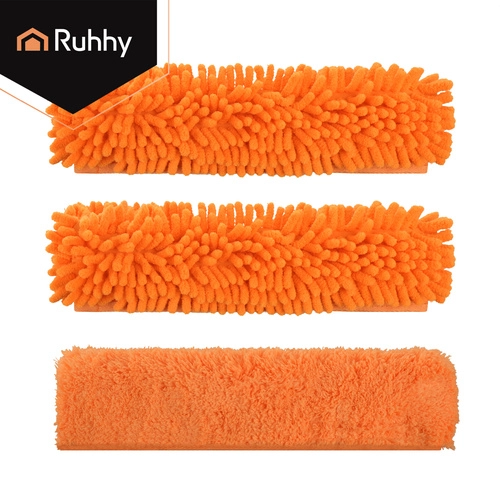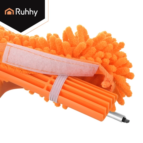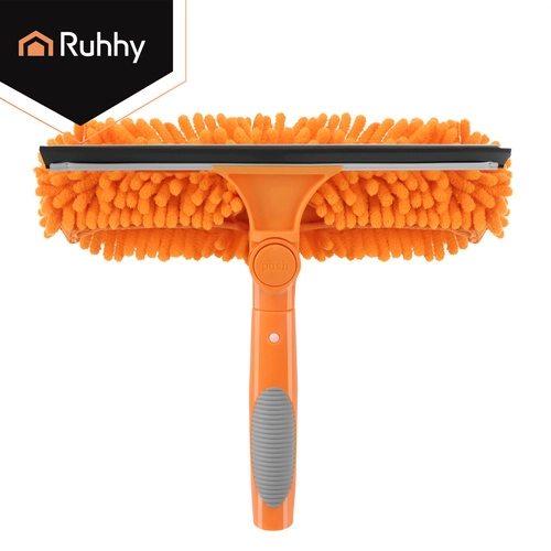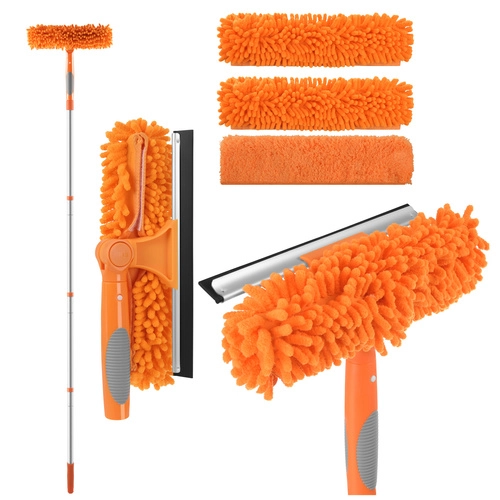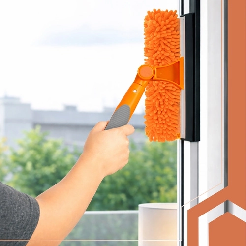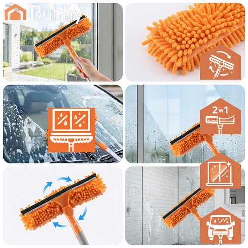 Obojstranná hlavica spája savé mikrovlákno na umývanie a gumovú stierku na rýchle stiahnutie vody bez šmúh. Tri vymeniteľné návleky (2× chenille, 1× hladký coral velvet) zlepšia účinnosť čistenia podľa typu nečistôt a sú prateľné a znovupoužiteľné.