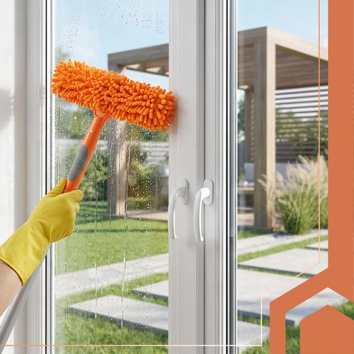 Najprv uvoľníte nečistoty mäkkým mikrovláknom, potom zotriete vodu gumovou stierkou pre kryštálovo čistý výsledok.