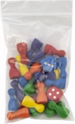 Súčasťou balenia sú aj dve štandardné hracie kocky, takže máte všetko potrebné na okamžité hranie. Kompaktné zip vrecko s rozmermi 7×13 cm udržiava figúrky aj kocky pokope a je praktické na cesty.