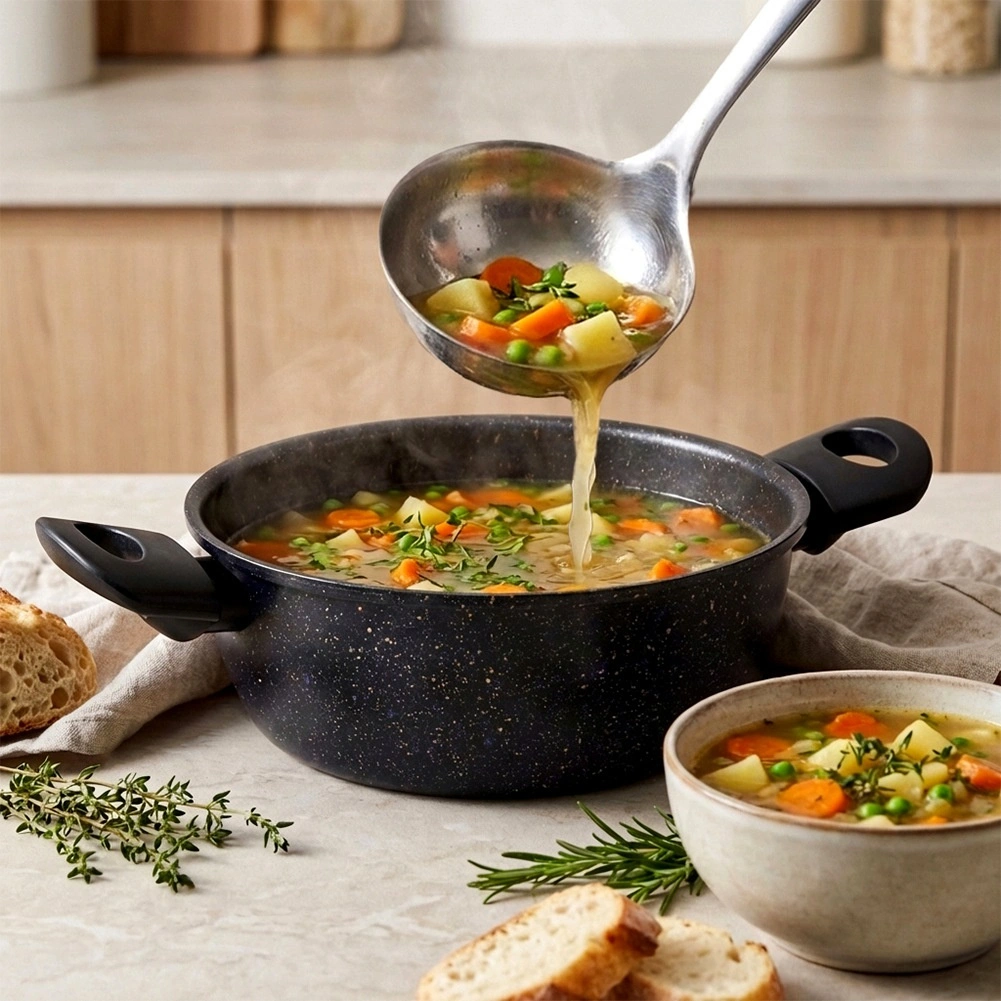 Odolná granitová vrstva zabraňuje pripaľovaniu a umožňuje prípravu pokrmov s minimom tuku. Čistenie je rýchle a bez námahy.