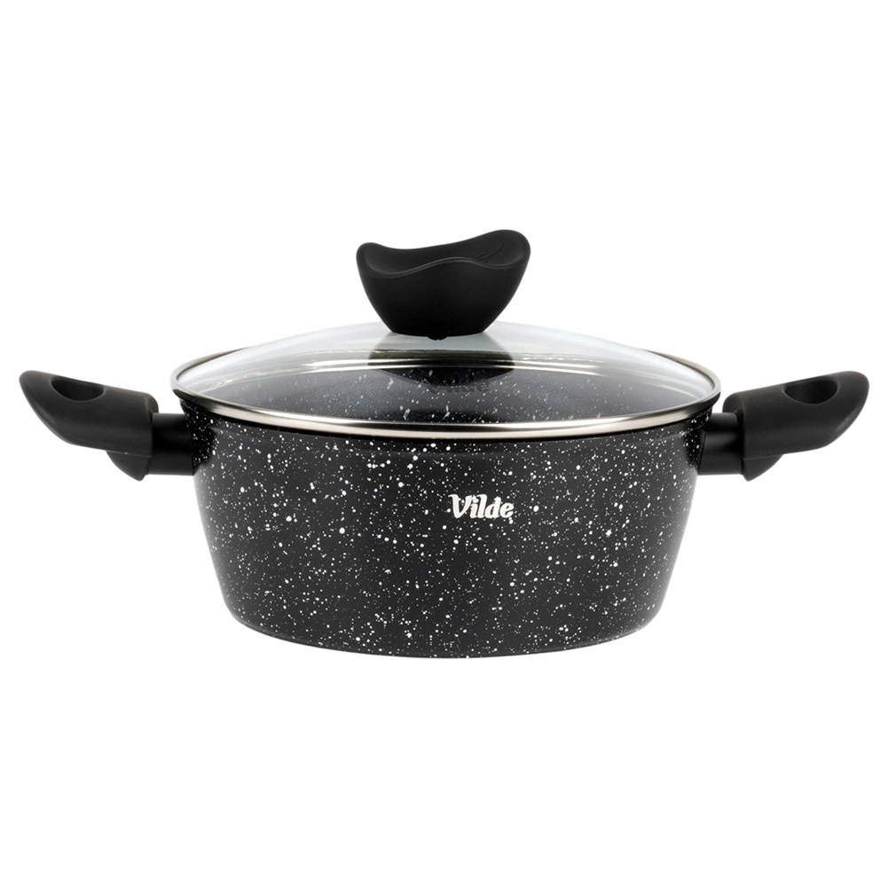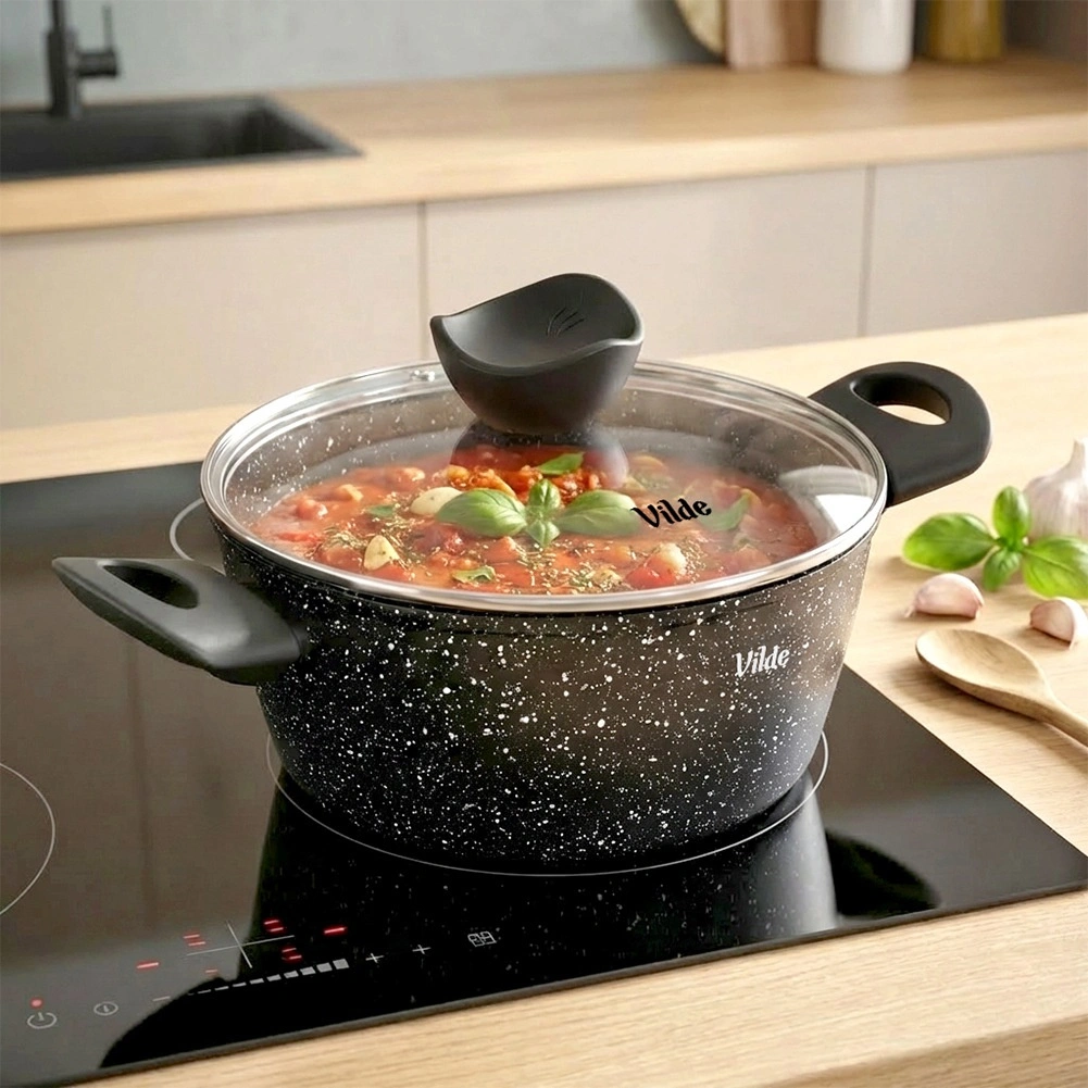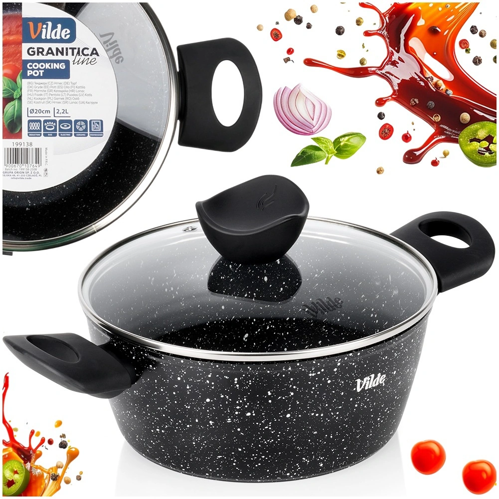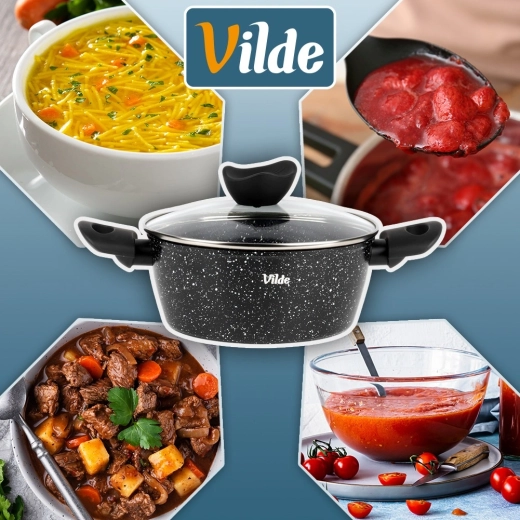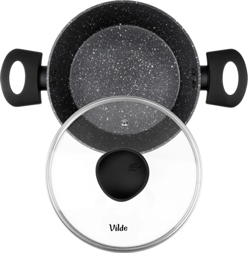 VILDE Granitica Line prináša kombináciu trvácnosti a pohodlia. Nepriľnavý granitový povrch zabraňuje pripaľovaniu, sklenená pokrievka s parným ventilom uľahčuje kontrolu varenia a ergonomické rukoväte s povrchom soft touch zvyšujú bezpečnosť aj komfort pri manipulácii.