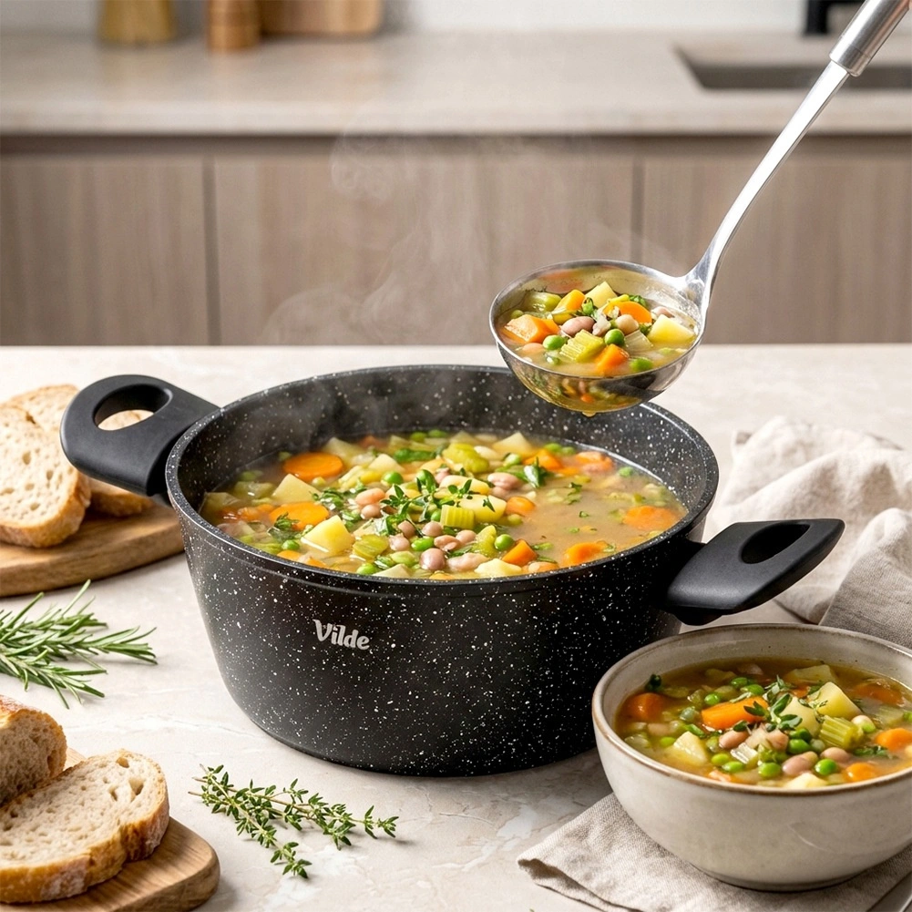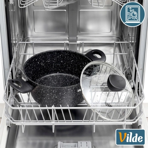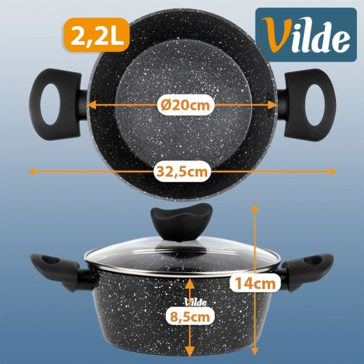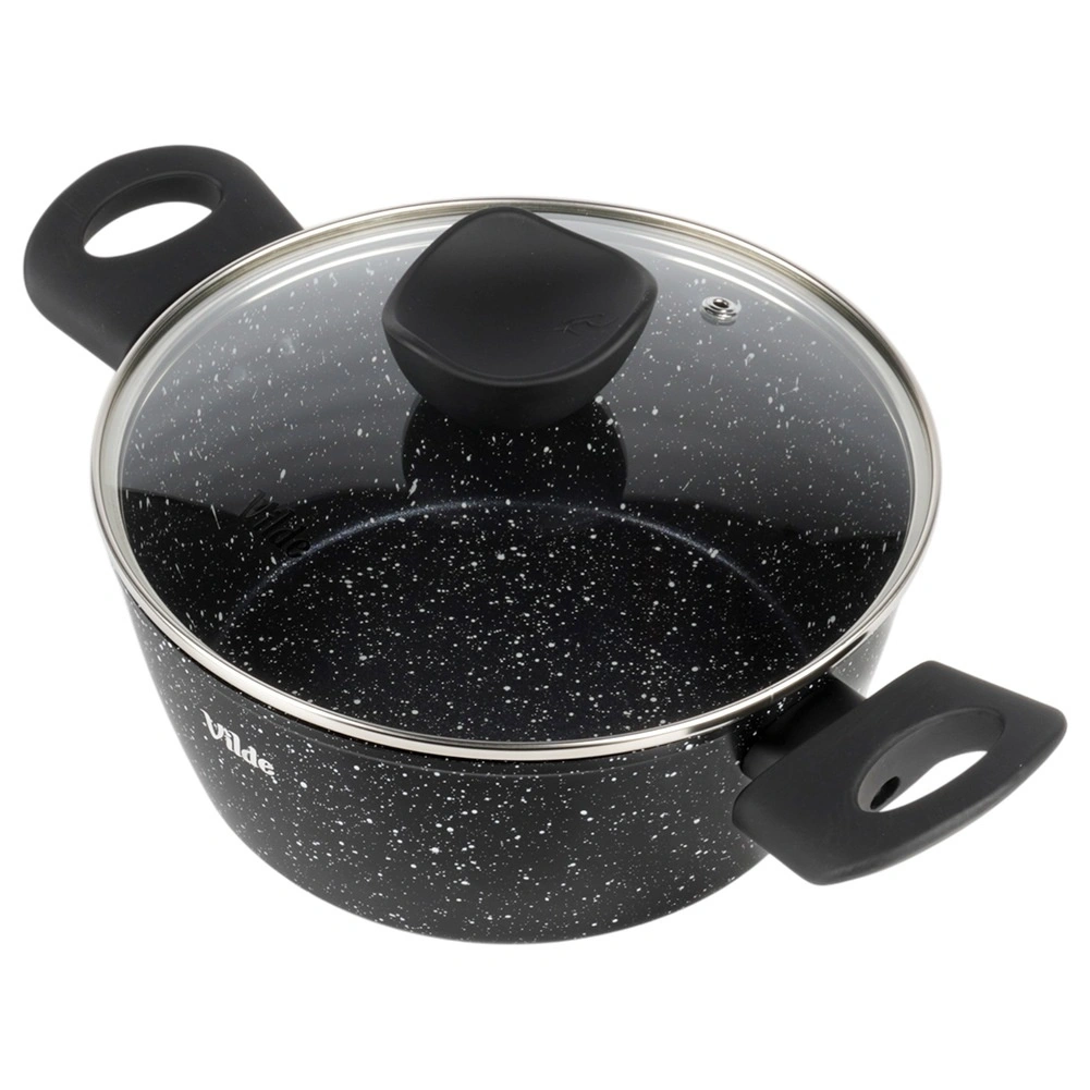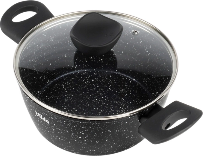 VILDE Granitica Line prináša kombináciu trvácnosti a pohodlia. Nepriľnavý granitový povrch zabraňuje pripaľovaniu, sklenená pokrievka s parným ventilom uľahčuje kontrolu varenia a ergonomické rukoväte s povrchom soft touch zvyšujú bezpečnosť aj komfort pri manipulácii.