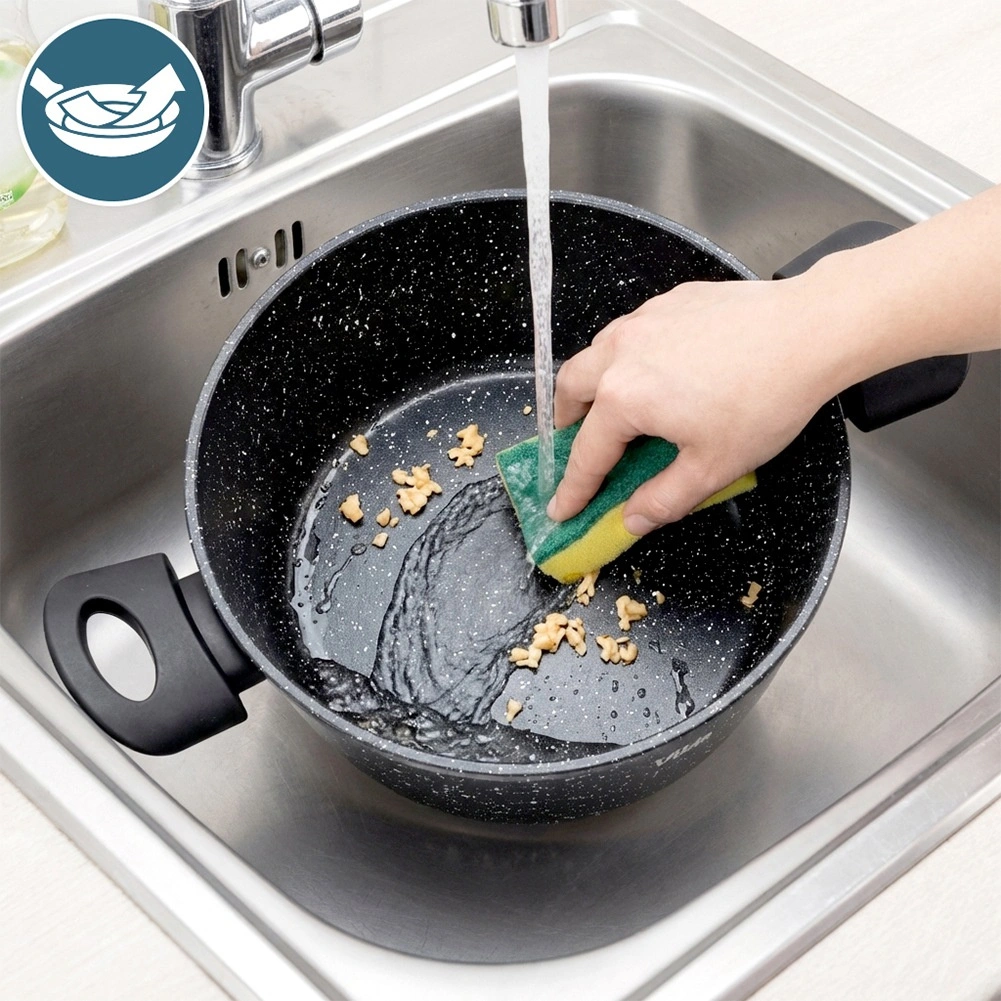 Elegantný granitový hrniec s priemerom 24 cm a objemom 3,6 l je ideálny na každodenné varenie polievok, omáčok aj dusenie. Trojvrstvová nepriľnavá granitová vrstva zabezpečuje rovnomerný rozvod tepla a ľahké uvoľňovanie pokrmov bez pripekania – pre chutné a zdravšie varenie s minimom oleja.
