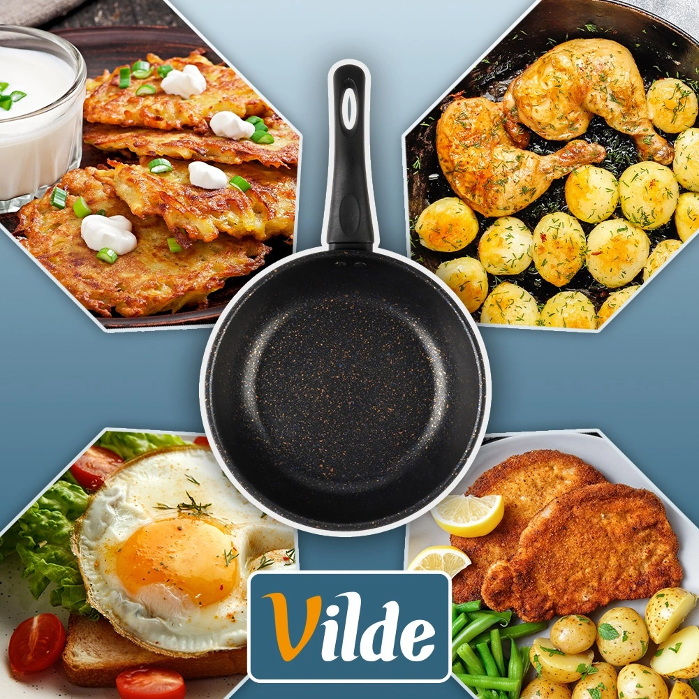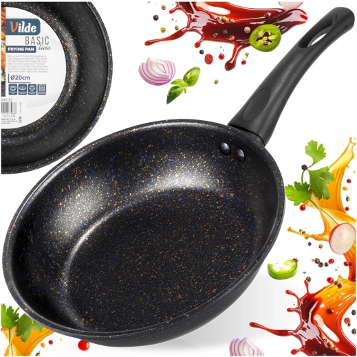 Štýlová a odolná panvica s priemerom 20 cm z kolekcie VILDE Basic Line je ideálna na každodenné vyprážanie a dusenie. Nepriľnavý granitový povrch umožňuje variť s minimom oleja, pokrmy sa nepripaľujú a panvica sa ľahko čistí — pokojne aj v umývačke.