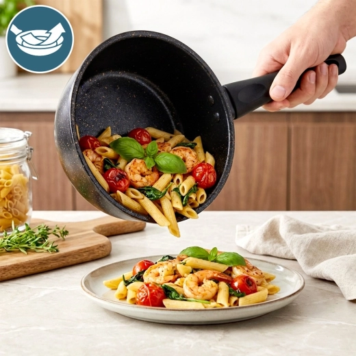 Dlhá ergonomická rúčka zaisťuje pevný úchop a bezpečné prenášanie horúceho riadu pri varení omáčok a polievok.