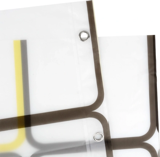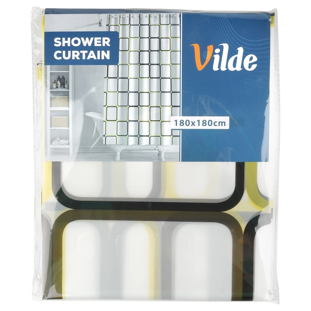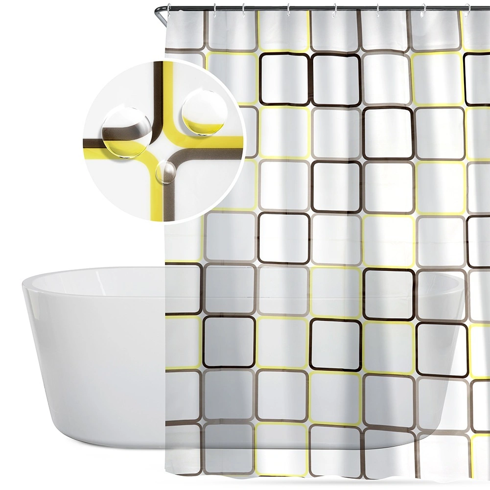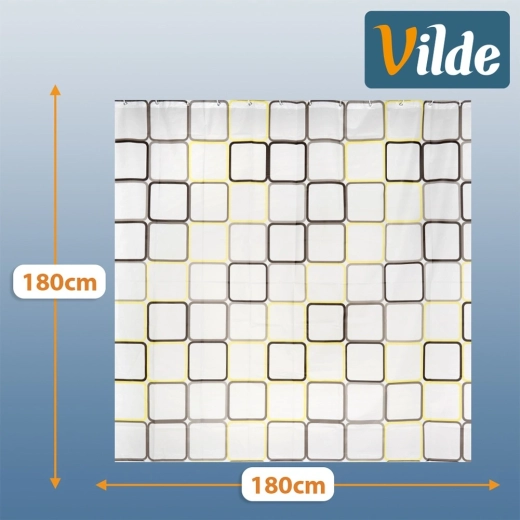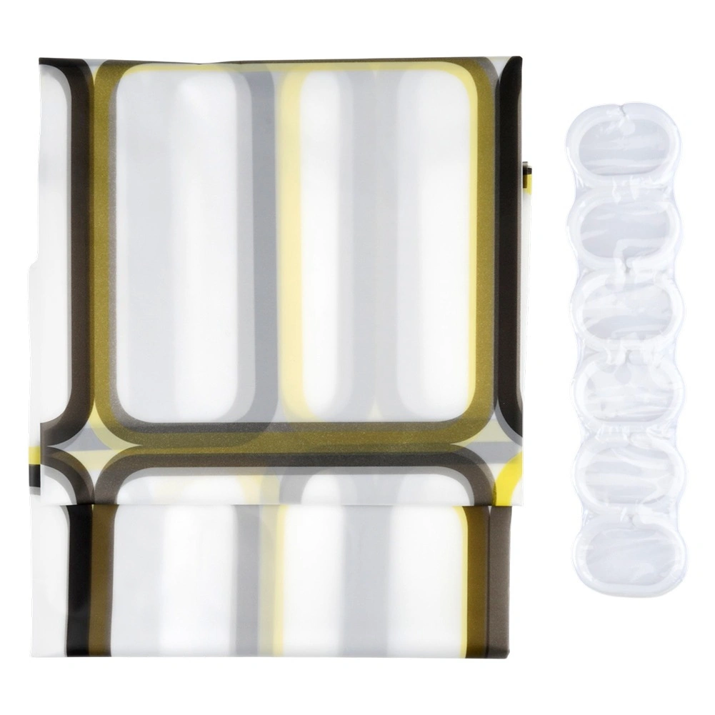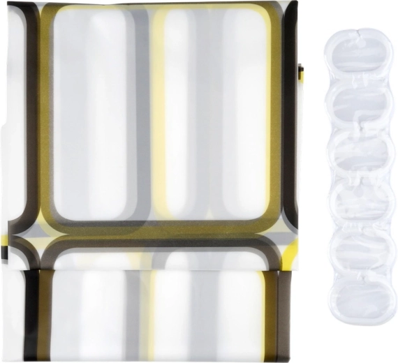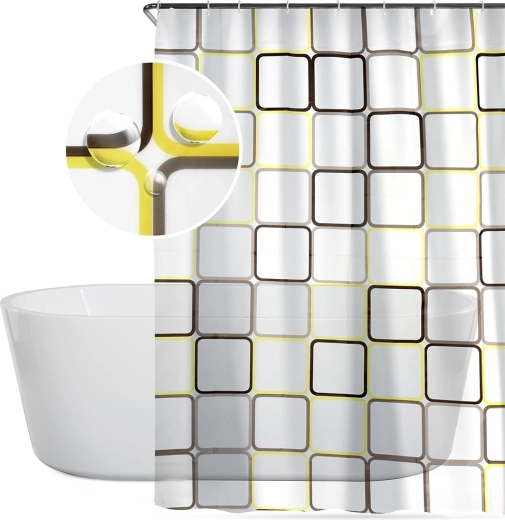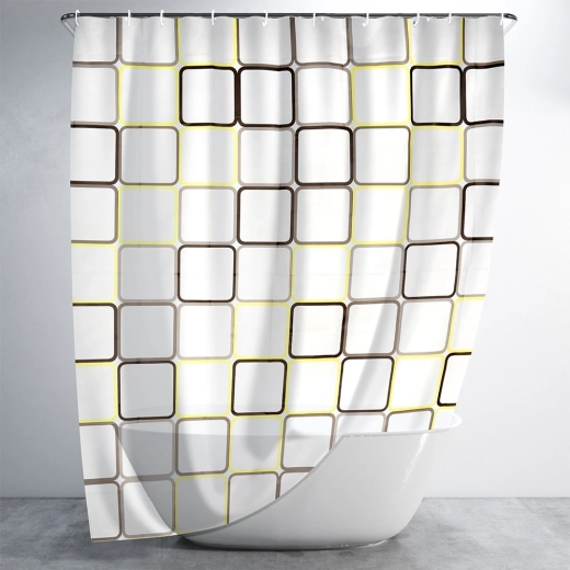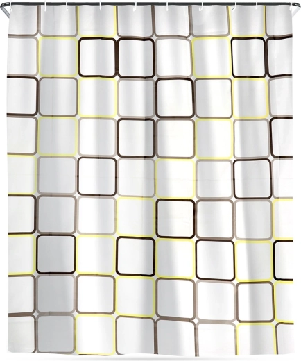 Objavte praktické riešenie pre každodennú kúpeľňu: sprchový záves z materiálu PEVA, ktorý je ľahký, odolný a šetrný k životnému prostrediu. Polopriehľadný biely podklad s geometrickými štvorcami v žltých a hnedých tónoch dodá interiéru svieži, moderný vzhľad a zároveň zachová potrebné súkromie.