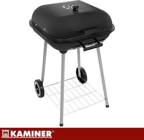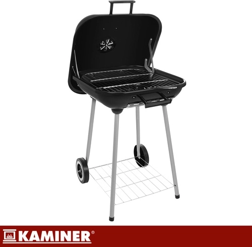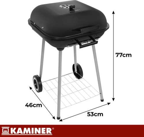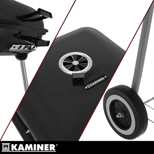 Kompaktný a mobilný záhradný gril KAMINER s poklopom ponúka rýchlejšie a rovnomernejšie grilovanie, lepšie udržanie tepla vďaka 1 mm smaltovanému veku a pohodlné presúvanie na kolieskach. Chrómovaný rošt 43,5 × 38,5 cm zvládne až 3,4 kg mäsa, regulovateľné prívody vzduchu uľahčia precíznu kontrolu žiaru a spodná polica poskytne praktický úložný priestor pre uhlie a príslušenstvo.