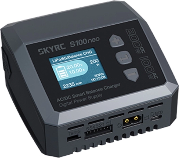 Kompaktná a výkonná nabíjačka SkyRC S100neo pre RC a dielenské použitie ponúka AC/DC napájanie, až 200 W výkonu na DC a presné vyvažovanie článkov do 1000 mA. Podporuje širokú škálu akumulátorov (LiPo, LiHV, LiFe, LiIon, NiMH, NiCd, Pb), má prehľadný 1,77" farebný displej a zvládne aj digitálny napájací režim CC/CV.
