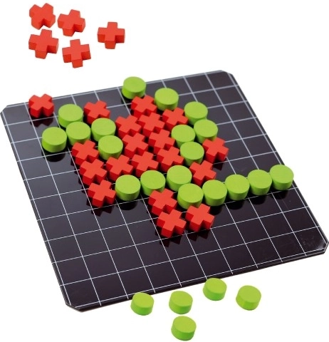 Hra obsahuje drevené herné kamene v tvare koliesok Ø 1,5 cm a krížikov 1,5x1,5 cm. Všetky kamene sú podlepené magnetom, čo uľahčuje ich použitie na tabuľke.