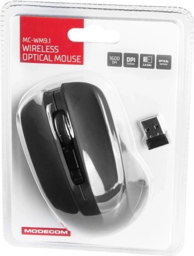 Modecom MC-WM9.1 je univerzálna bezdrôtová optická myš s ergonomickým tvarom, nastaviteľným DPI 800/1200/1600 a spoľahlivým 2,4 GHz pripojením. Ponúka 4 tlačidlá, príjemný povrch a automatické úsporné režimy pre dlhšiu výdrž.