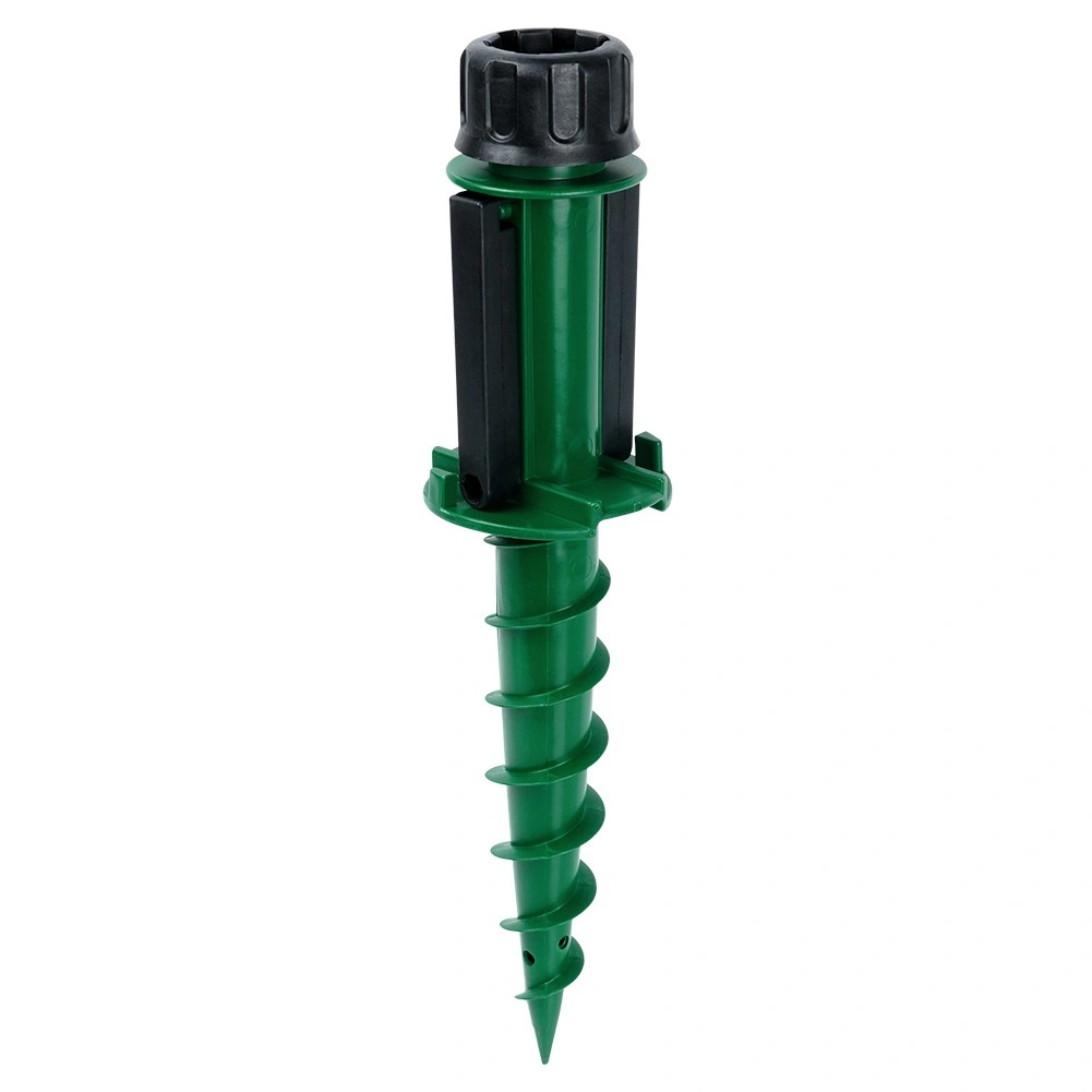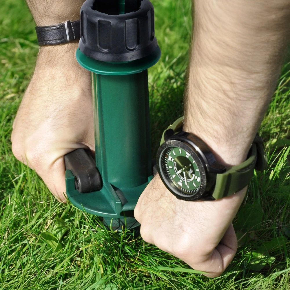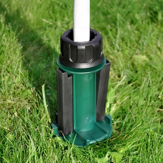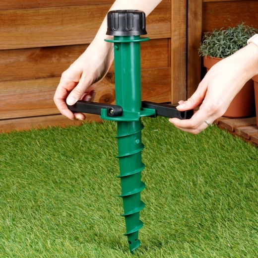 Vrchná dotahovacia objímka sa prispôsobí bežným priemerom tyčí slnečníkov (cca 2,2–3,3 cm) a udrží ich bezpečne na mieste. Bočné vyklápacie madlá poskytujú páku pre jednoduché zaskrutkovanie aj vybratie zo zeme. Ideálna voľba do záhrady, na pláž, chatu aj kempovanie – bez potreby ťažkých betónových podstavcov.
