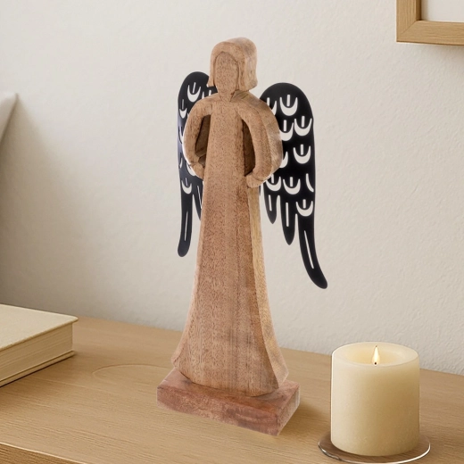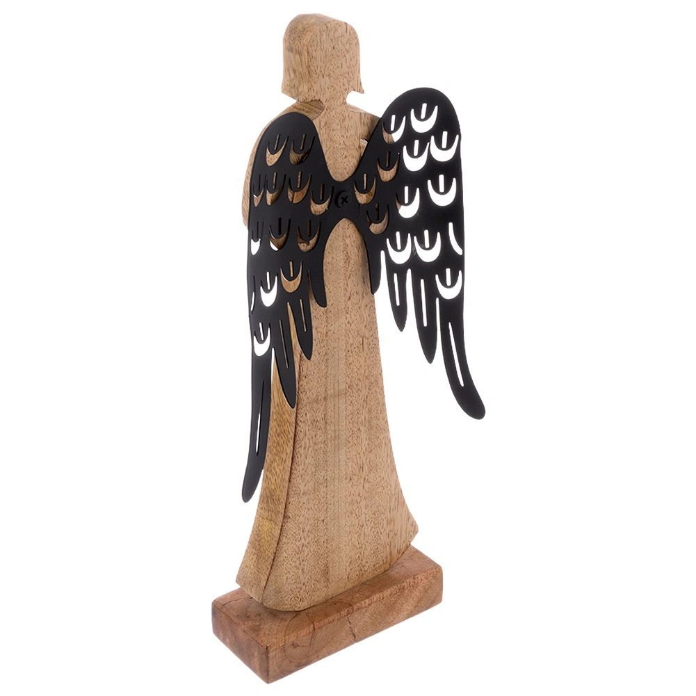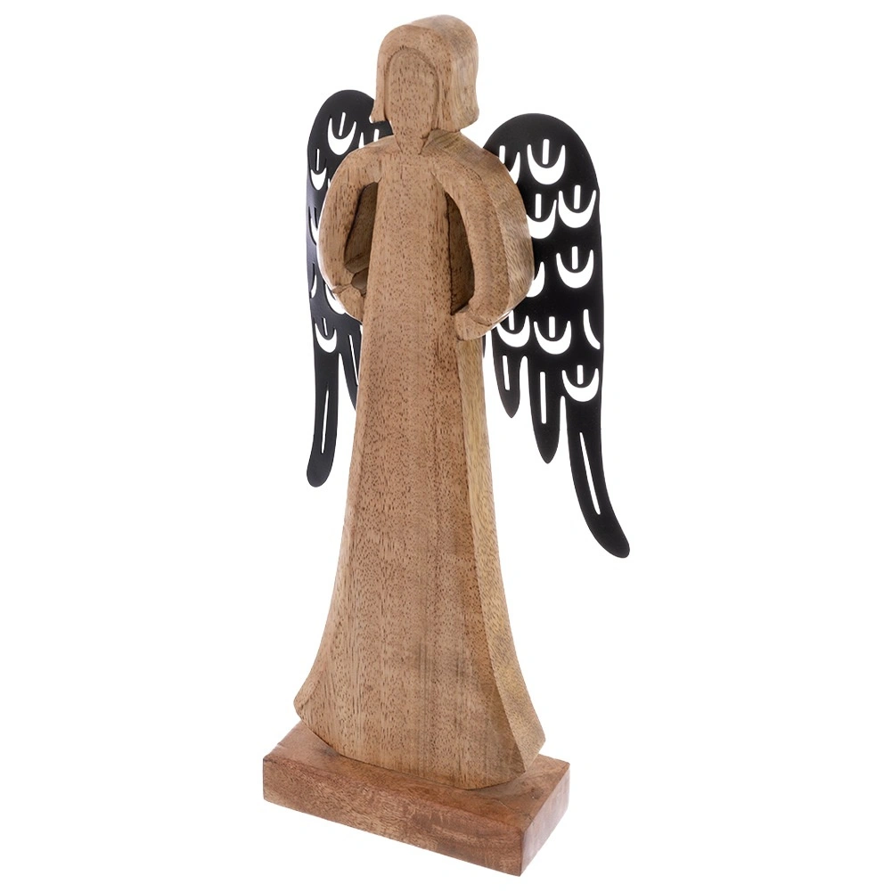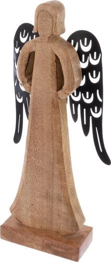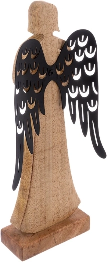 Táto pôsobivá figúrka anjela je ručne vyrobená z prírodného mangového dreva a doplnená o kontrastné čierne kovové krídla s dekoratívnym výrezom. Nadčasové prevedenie vynikne na polici, komode aj konferenčnom stolíku a jednoducho zapadne do škandinávskeho, boho aj moderného štýlu.