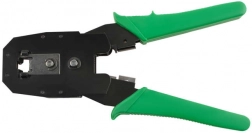 Krimpovacie kliešte pre 8P8C (RJ45), 6P6C (RJ12) a 6P4C (RJ11) s vymeniteľnými britmi pre dlhú životnosť, strihom a odizolovaním v jednom nástroji.