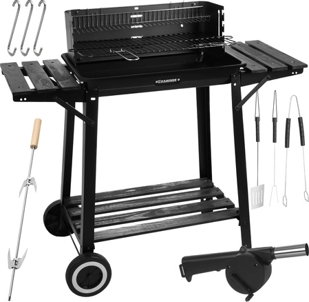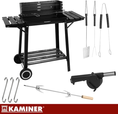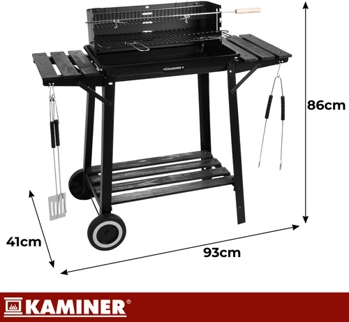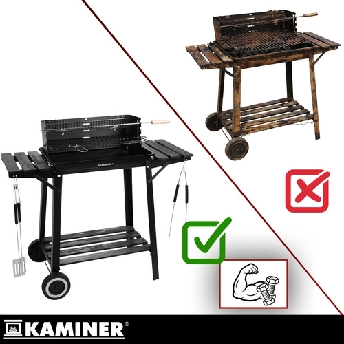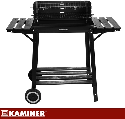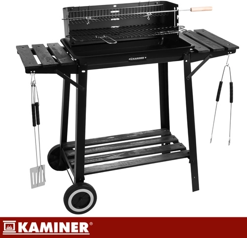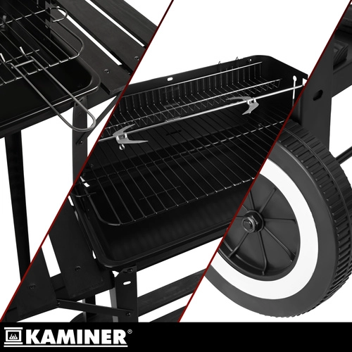 Stabilný a prenosný záhradný gril KAMINER ponúka hlavný chrómovaný rošt, horný ohrievací rošt a ražeň s vidlicou pre rovnomerné pečenie. Vďaka odkladacím policiam, háčikom na náradie a kolesám pre ľahké presúvanie si užijete pohodlné grilovanie a rýchlejší upratovanie.