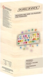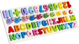 Vyberateľné drevené dieliky písmen a číslic s príslušnými tvarmi na doske uľahčujú rozpoznávanie tvarov, pomenovávanie a prvé skladanie slov aj jednoduché počítanie.