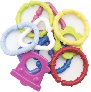 Táto sada farebných plastových tvarov je ideálna prvá hračka pre bábätká. Dieliky sa do seba ľahko zacvaknú a pevne držia, takže si deti môžu opakovane stavať retiazky a jednoduché konštrukcie. Rôzne textúry a farby poskytujú bohatú zmyslovú stimuláciu a hrkavý efekt deti zaujme aj upokojí.