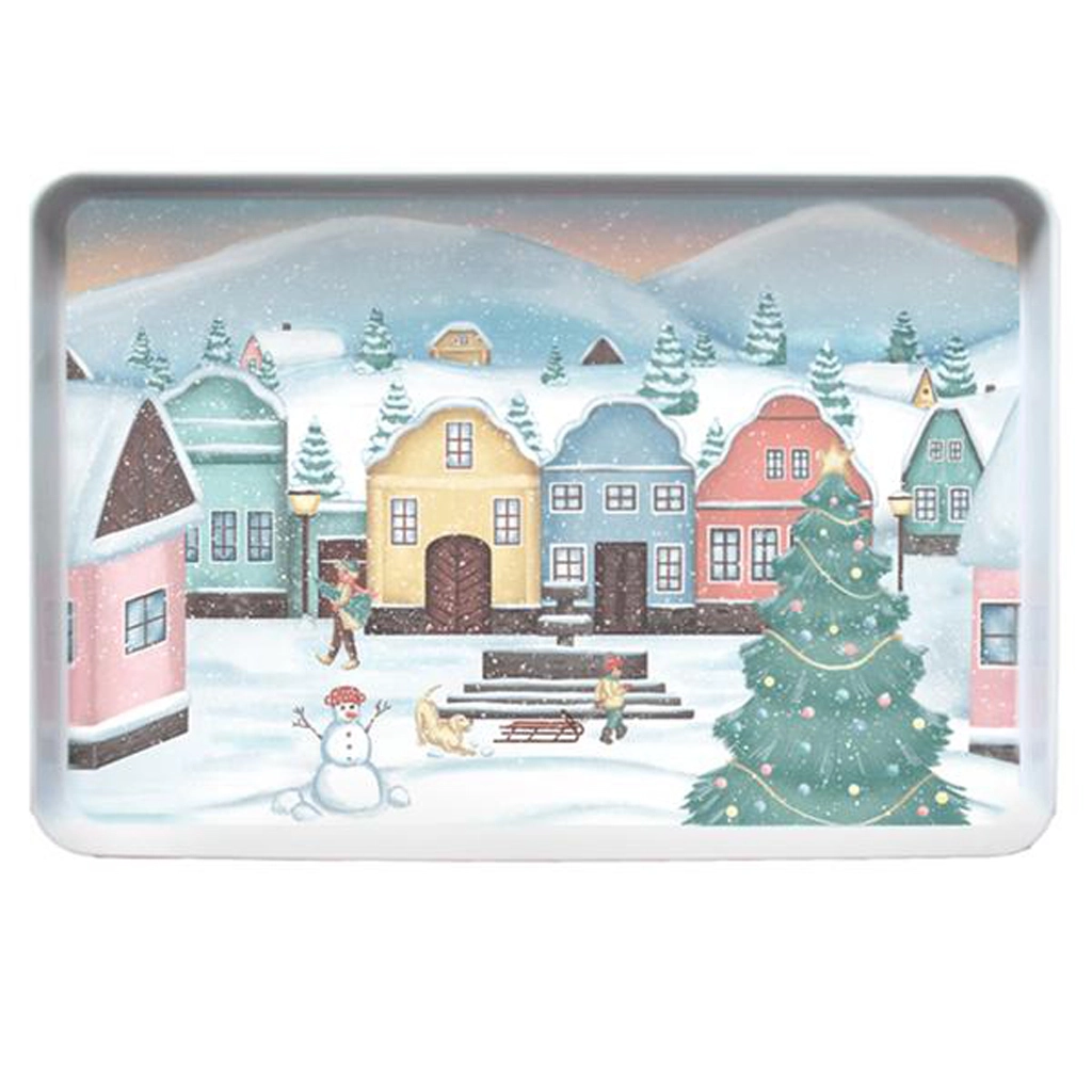 Štýlový melamínový táck s motívom zimnej dedinky premení každé servírovanie na slávnostný okamih. Vďaka rozmerom 40 × 27 cm ponúka dostatok miesta na zákusky, chlebíčky aj nápoje. Ľahký, odolný a ľahko umývateľný materiál je ideálny na každodenné používanie aj vianočné hostiny.