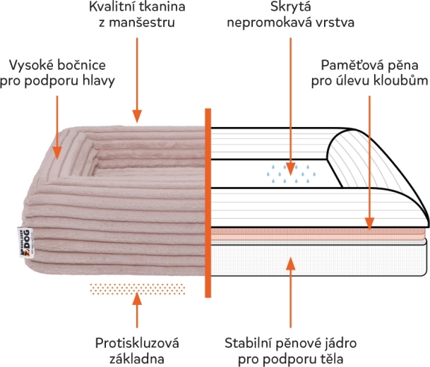 Poťah z hebkého manšestru so zipsami YKK možno jednoducho sňať a vyprať na 30 °C. Vnútorná vodoodolná vrstva chráni penové jadro pred vlhkosťou.