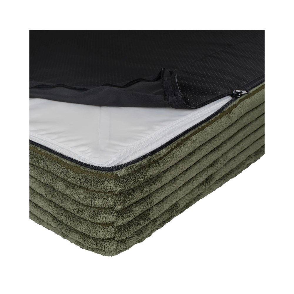 Poťah z hebkého manšestru (100% polyester) s certifikáciou OEKO-TEX Standard 100 je príjemný na dotyk, rýchlo schne a je odolnejší voči zápachu. Penové jadro spĺňa prísne požiadavky CertiPUR-US – bez formaldehydu a ťažkých kovov. Vďaka zipsom YKK poťah ľahko zložíte a vyperiete v práčke na 30 °C, zatiaľ čo vodoodolná vnútorná vrstva chráni penu pred vlhkosťou.
