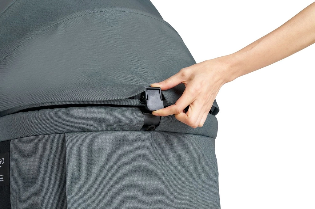 Integrovaný zámok rámu udrží kočík bezpečne zatvorený pri prenášaní a skladovaní.