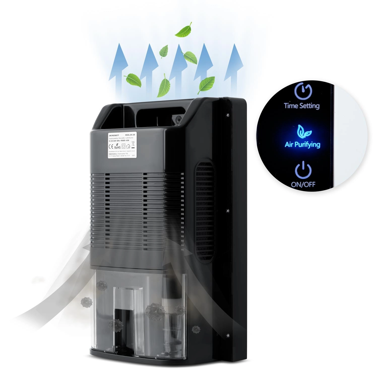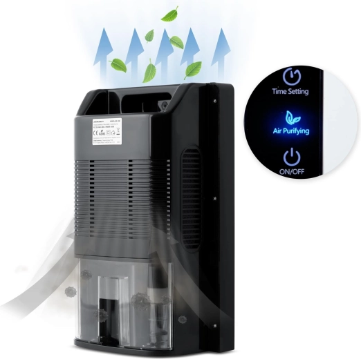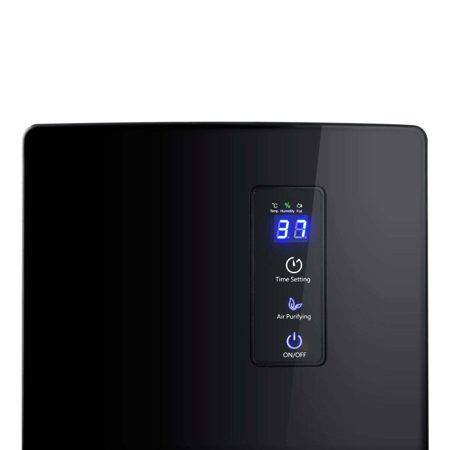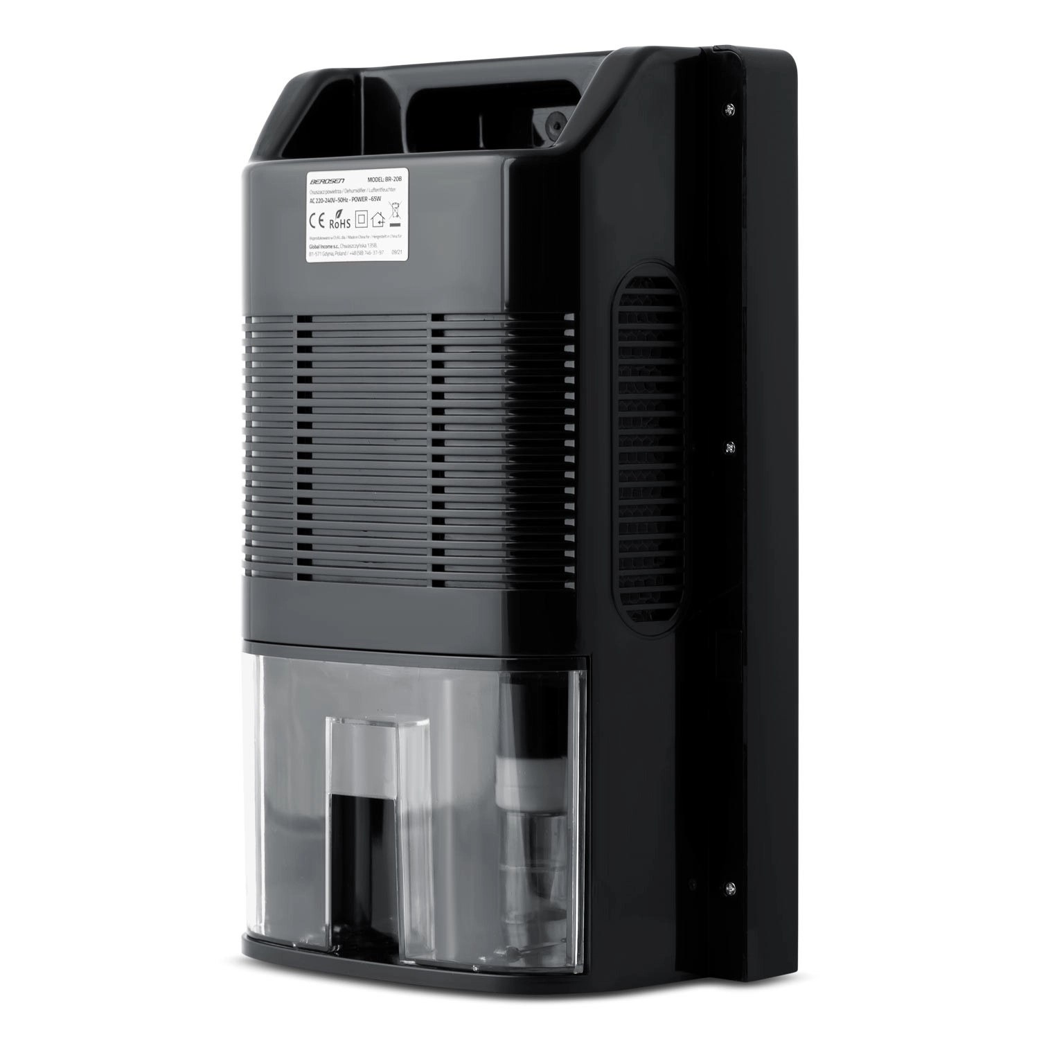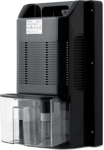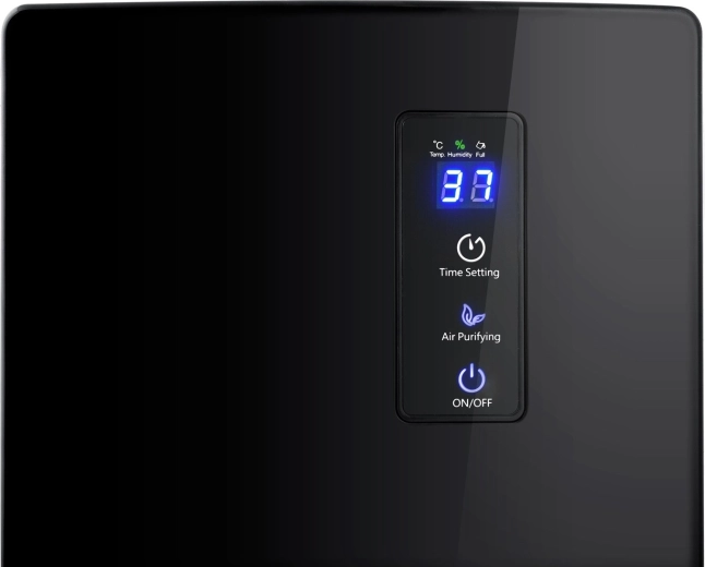 Termoelektrická technológia Peltier spoľahlivo kondenzuje vlhkosť bez použitia chémie. Prehľadný dotykový LED panel zobrazuje všetky kľúčové informácie a časovač 1–24 h uľahčí plánovanie prevádzky. Detektor hladiny vody pri naplnení nádržky (2 l) zariadenie automaticky vypne a upozorní zmenou farby kontrolky.