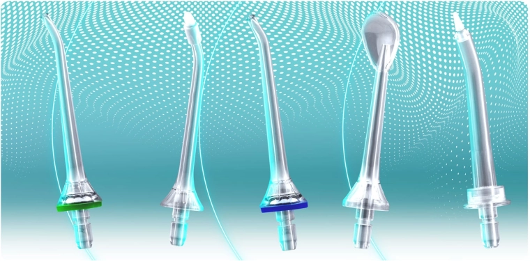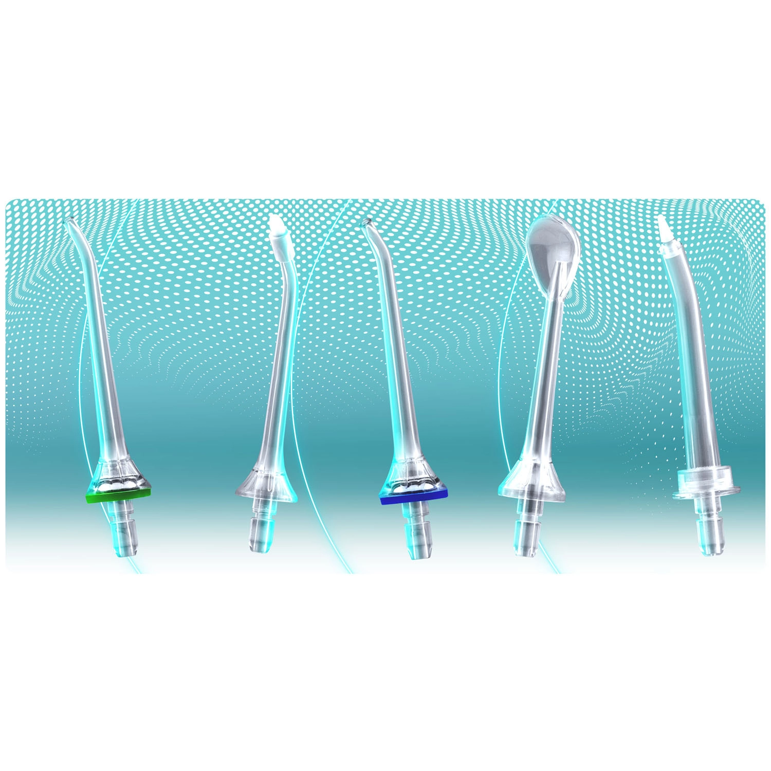 V balení nájdete 5 špecializovaných trysiek (2 štandardné, na jazyk, ortodontickú a pre parodontálne vačky), USB‑C kábel a praktické puzdro. Vstavaná batéria vydrží na jedno nabitie až 3–4 týždne, takže máte čistý úsmev vždy poruke.