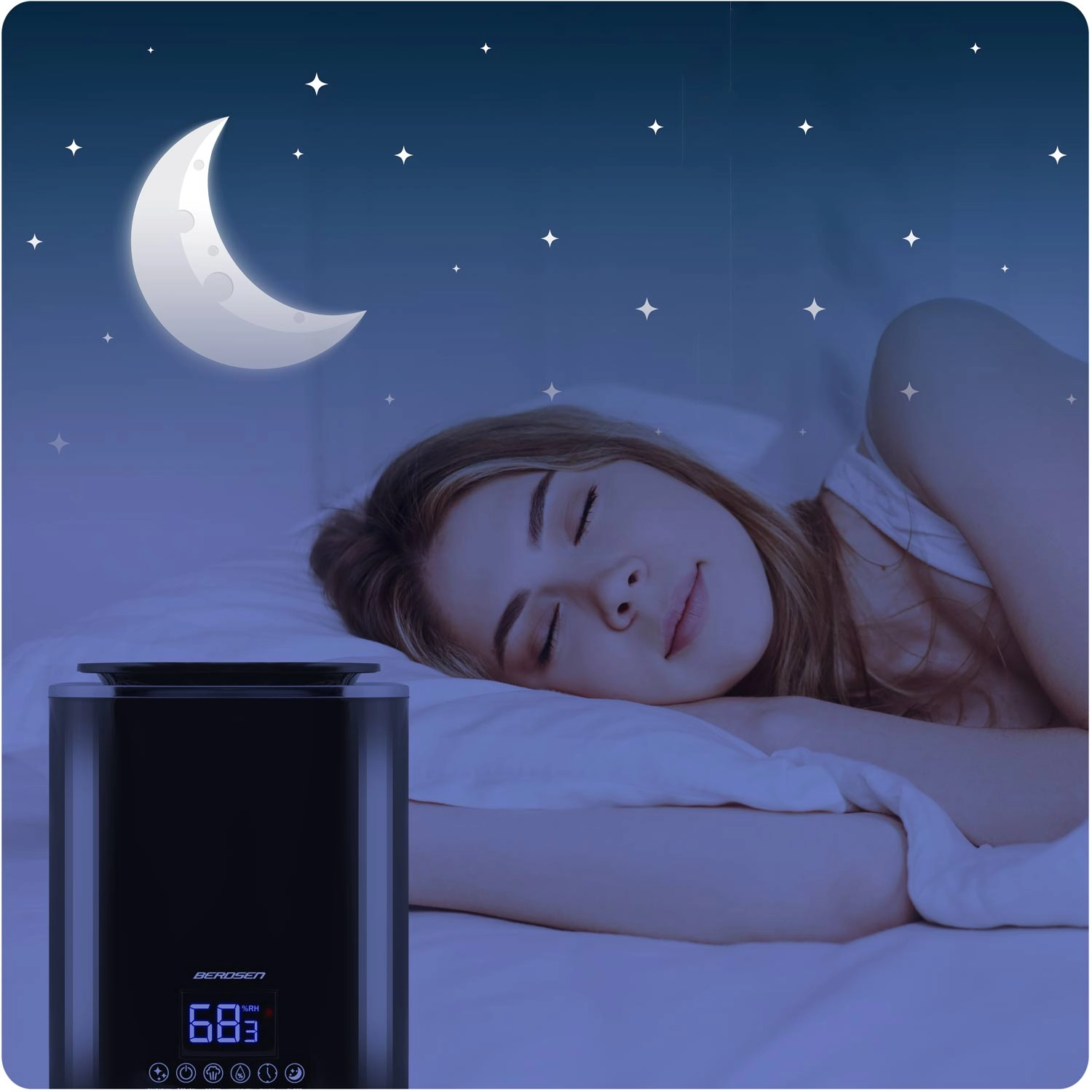 Inteligentný hygrostat (45–90 %) udržiava nastavenú vlhkosť a po jej dosiahnutí prepne prístroj do standby. Nočný režim stlmí displej a zariadenie ticho pokračuje v práci. Intuitívne dotykové ovládanie dopĺňa časovač 1–9 h a praktické automatické vypnutie pri nedostatku vody.