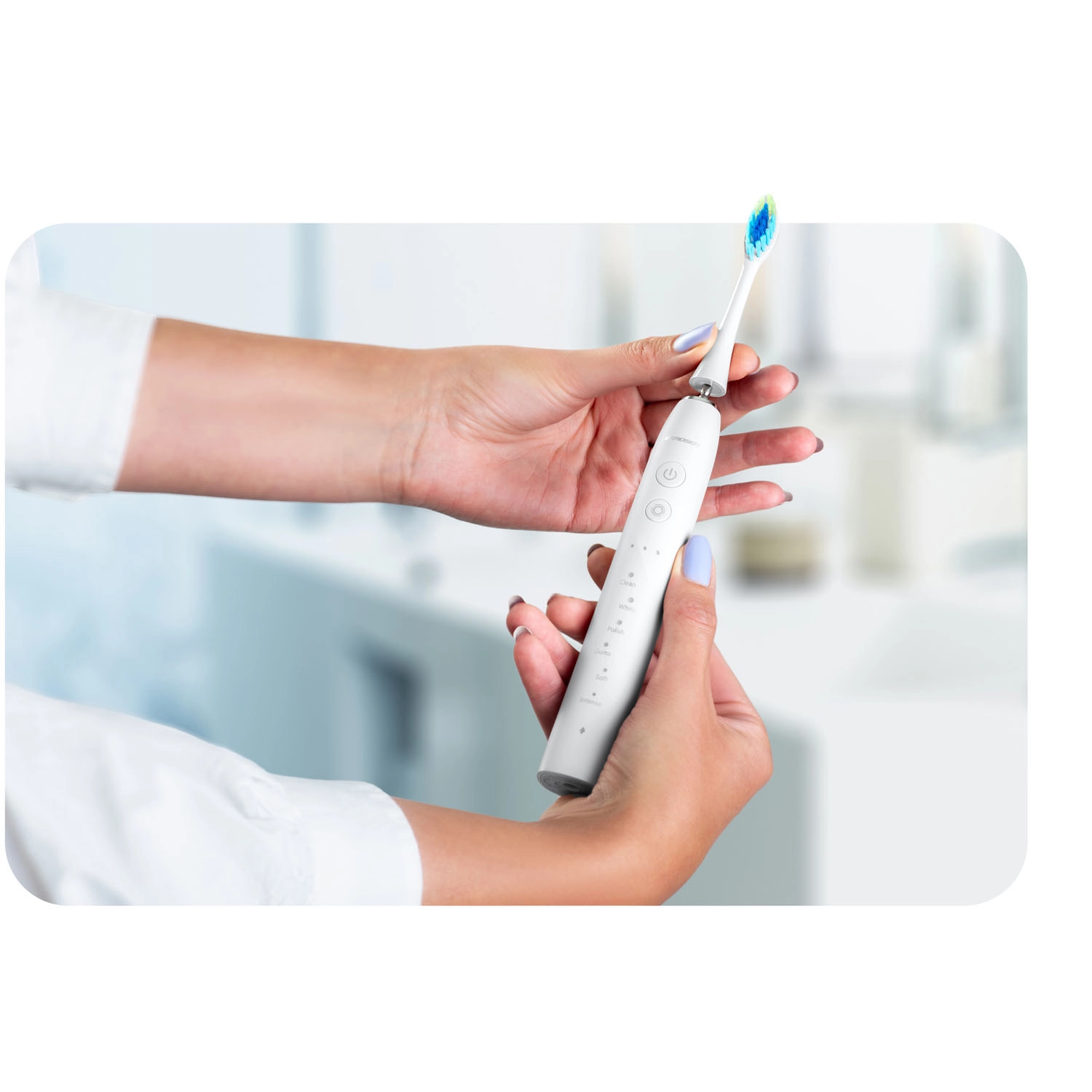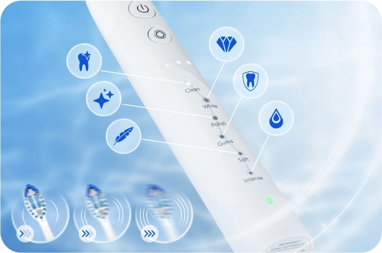 • 6 režimov: Clean (denné čistenie), White (bielenie), Polish (leštenie), Gums (starostlivosť o ďasná), Soft (jemný), Intense (hĺbkové čistenie)