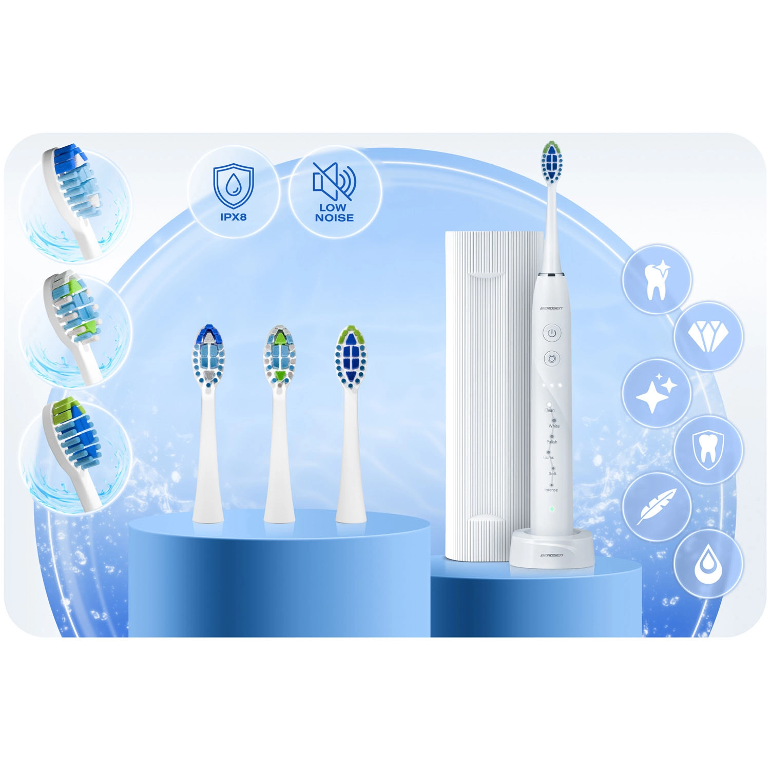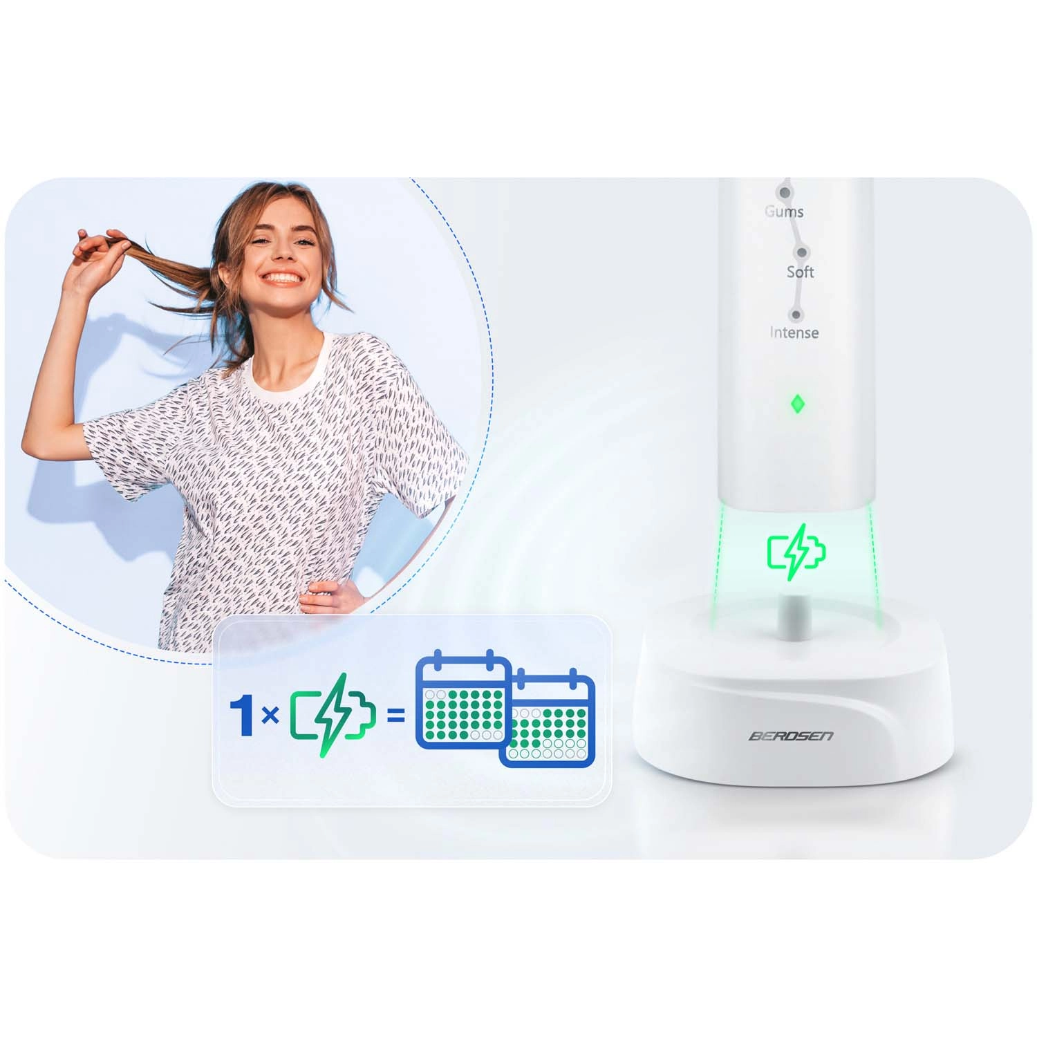 Berdsen Galaxy využíva pokročilú sonickú technológiu, ktorá jemne, no mimoriadne účinne narúša zubný povlak a dosahuje aj do ťažko dostupných miest. Inovatívna hlavica s jemnými štetinami kopíruje tvar zuba a zadná strana poslúži na čistenie jazyka pre svieži dych. Výsledkom je belší úsmev v priebehu niekoľkých týždňov a až 6× účinnejšie odstránenie povlakov než pri bežných manuálnych kefkách.