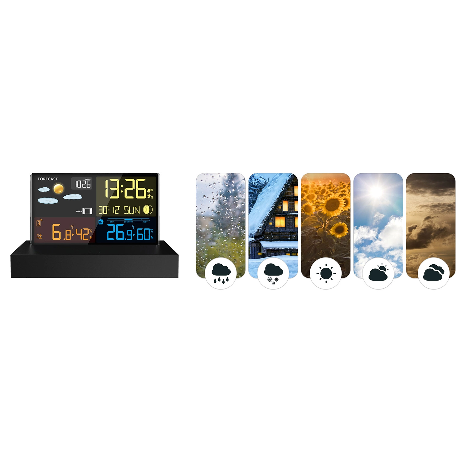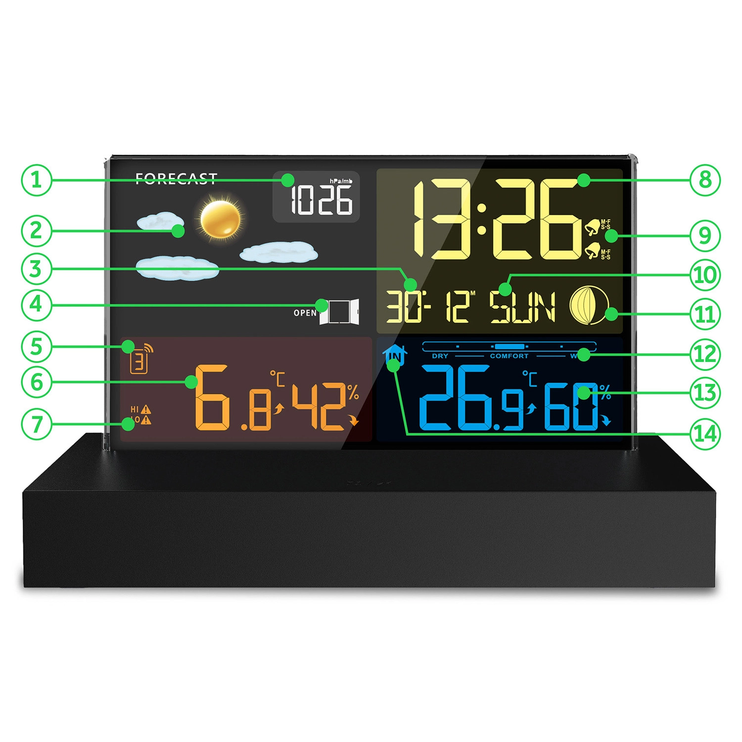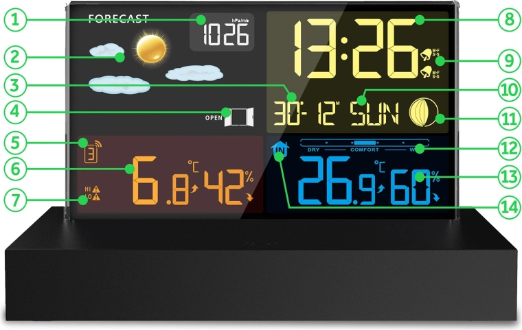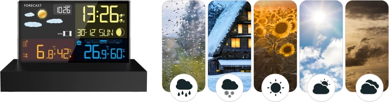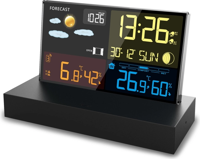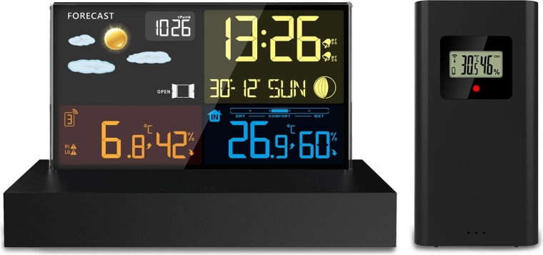 Veľký farebný displej zobrazuje čas, dátum, teplotu, vlhkosť, ikony počasia a trendy. Stanica analyzuje tlak, teplotu a vlhkosť a poskytuje presnú krátkodobú predpoveď.