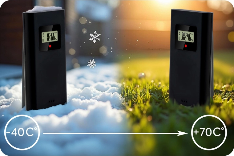 - Široké rozsahy merania: vnútri -9,9 až 50 °C, vonku -40 až 70 °C, vlhkosť 20–95 % RH, tlak 850–1100 hPa