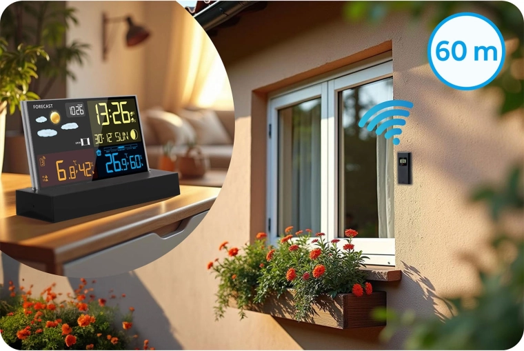 Bezdrôtová meteorologická stanica BD-912 ponúka presné meranie teploty a vlhkosti vnútri aj vonku, predpoveď na 12 hodín, rádiom riadené hodiny DCF a praktické funkcie ako teplotný alarm, fázy Mesiaca či indikátor komfortu. Vďaka bezdrôtovému čidlu so stabilným dosahom až 60 m a prehľadnému farebnému LCD máte počasie aj čas vždy po ruke.