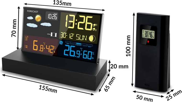 - Prehľadný farebný LCD s ikonami počasia, fázami Mesiaca a stavom batérie