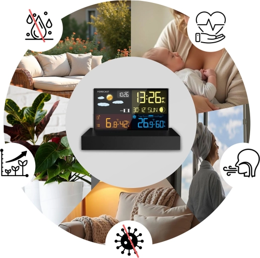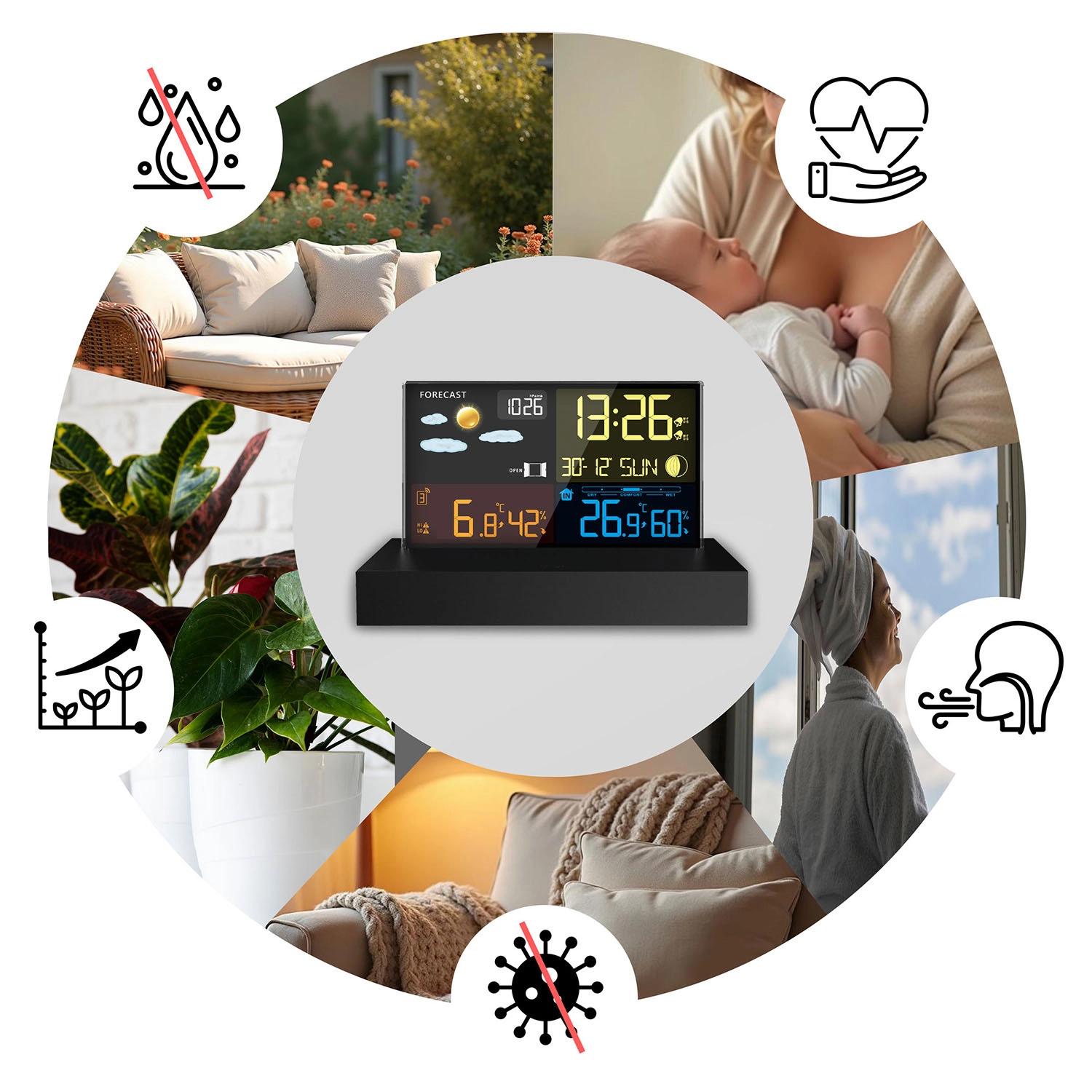 Rádiom riadený čas DCF, budík s funkciou odloženého budenia a indikátor komfortu pomáhajú riadiť denný režim aj zdravú klímu v miestnosti.